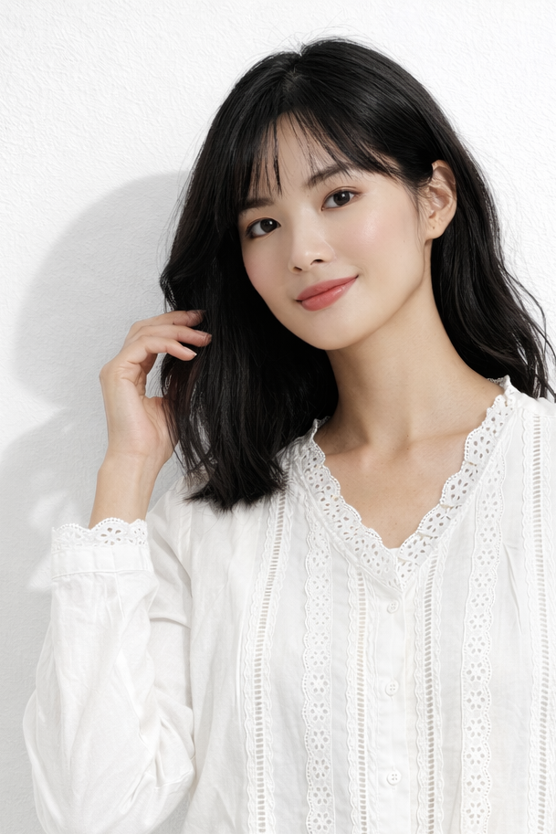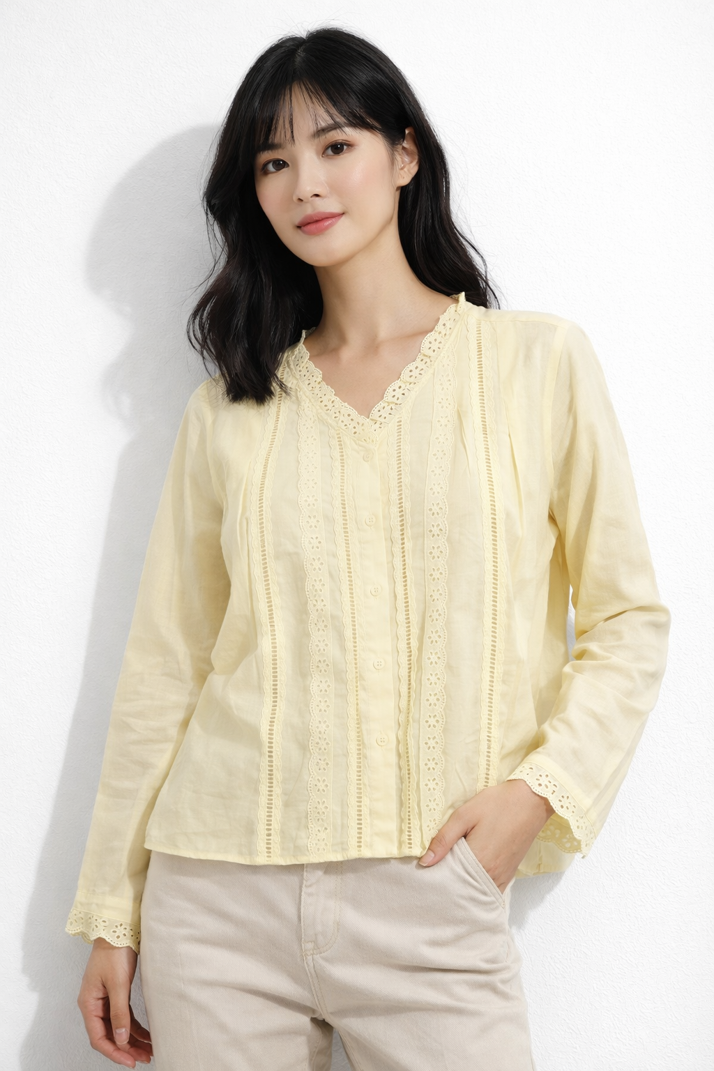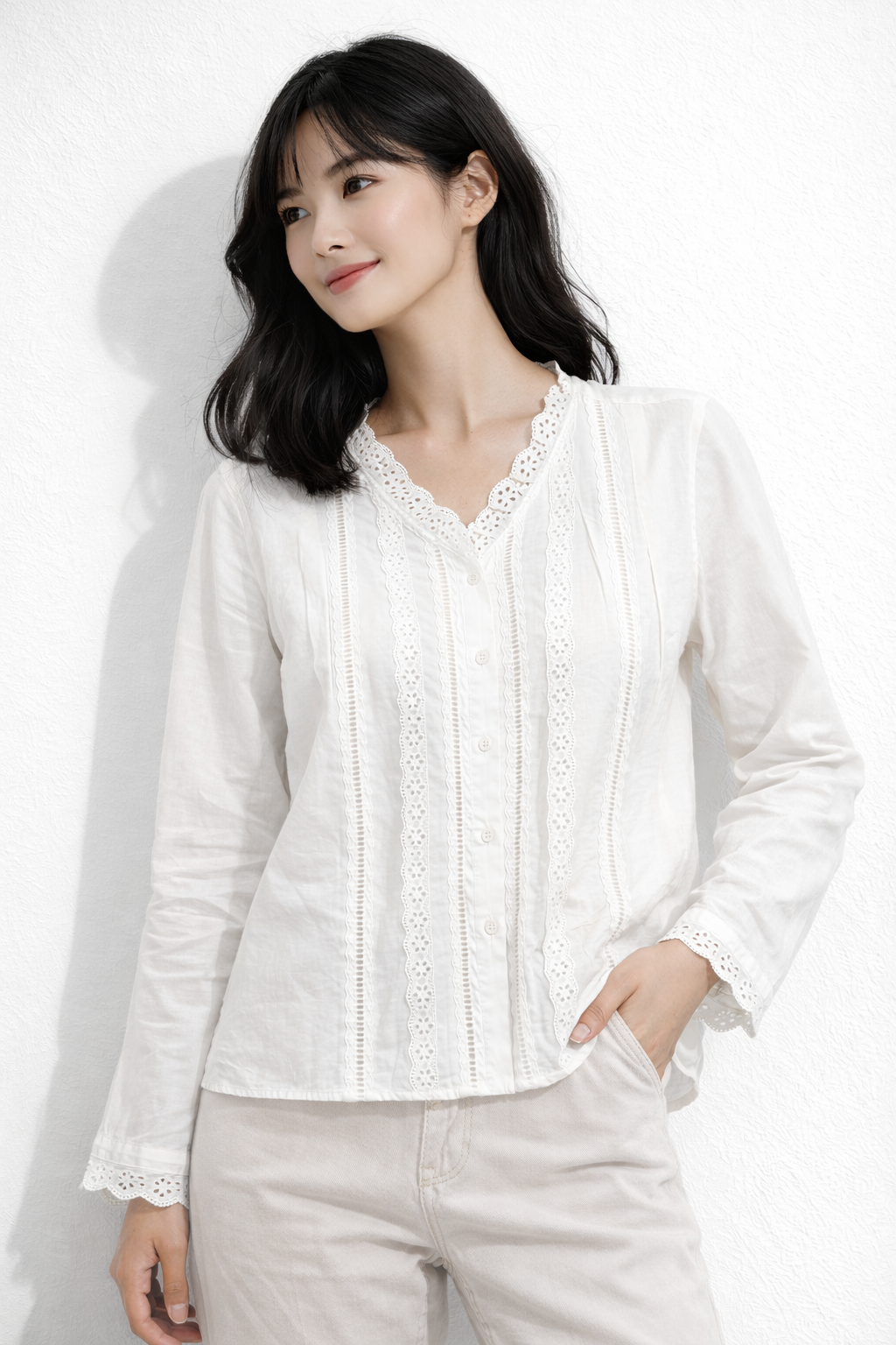 This elegant white blouse is crafted from a lightweight, airy fabric that offers a soft and comfortable feel. Designed with delicate eyelet lace detailing, it features vertical lace panels along the front and a beautifully scalloped V-neckline for a refined, feminine look. The long sleeves are finished with matching lace-trimmed cuffs, adding subtle charm and sophistication. With its relaxed yet polished silhouette and button-front closure, this blouse is perfect for both everyday wear and dressier occasions.