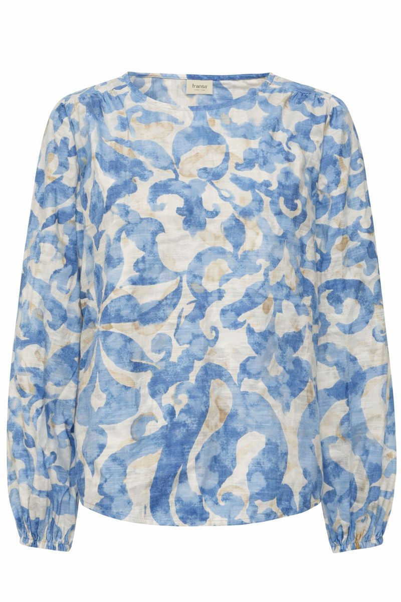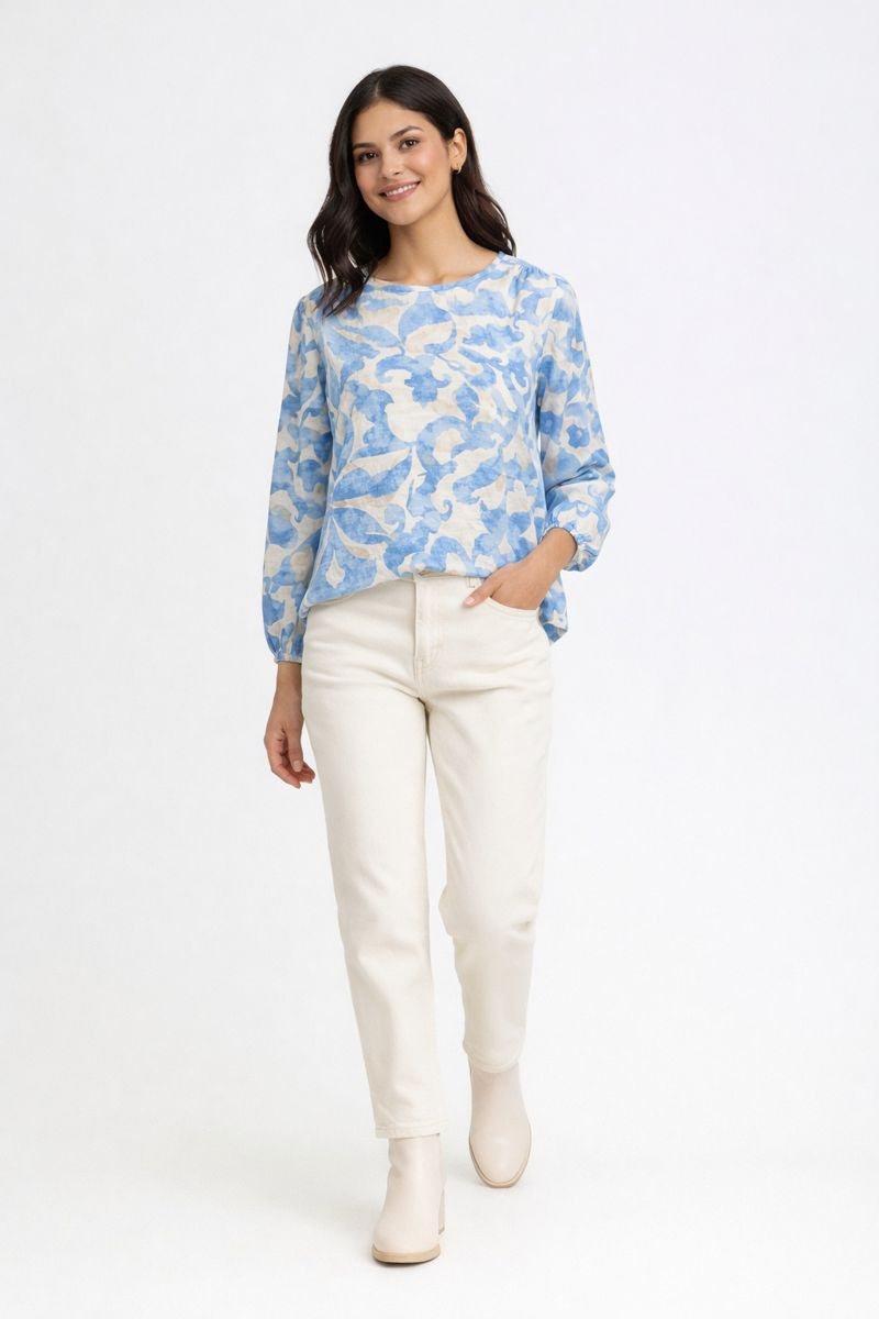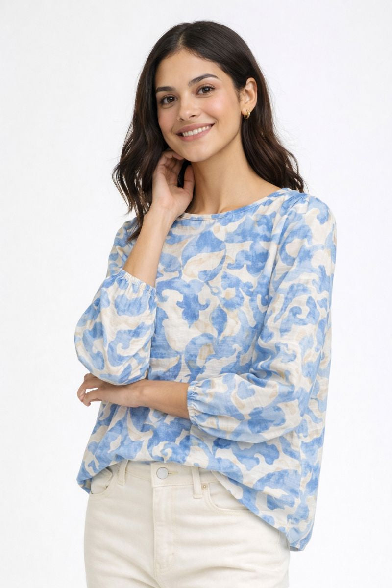 This beautifully lightweight blouse features an elegant abstract print in soft blue and cream tones, creating a fresh and timeless look. Designed with a classic round neckline and long sleeves finished with gentle elasticated cuffs, it offers both comfort and effortless style. The relaxed fit and airy fabric allow it to drape beautifully, making it perfect for everyday wear. Easy to dress up or down, this blouse pairs effortlessly with jeans, trousers, or skirts for a polished yet relaxed finish.