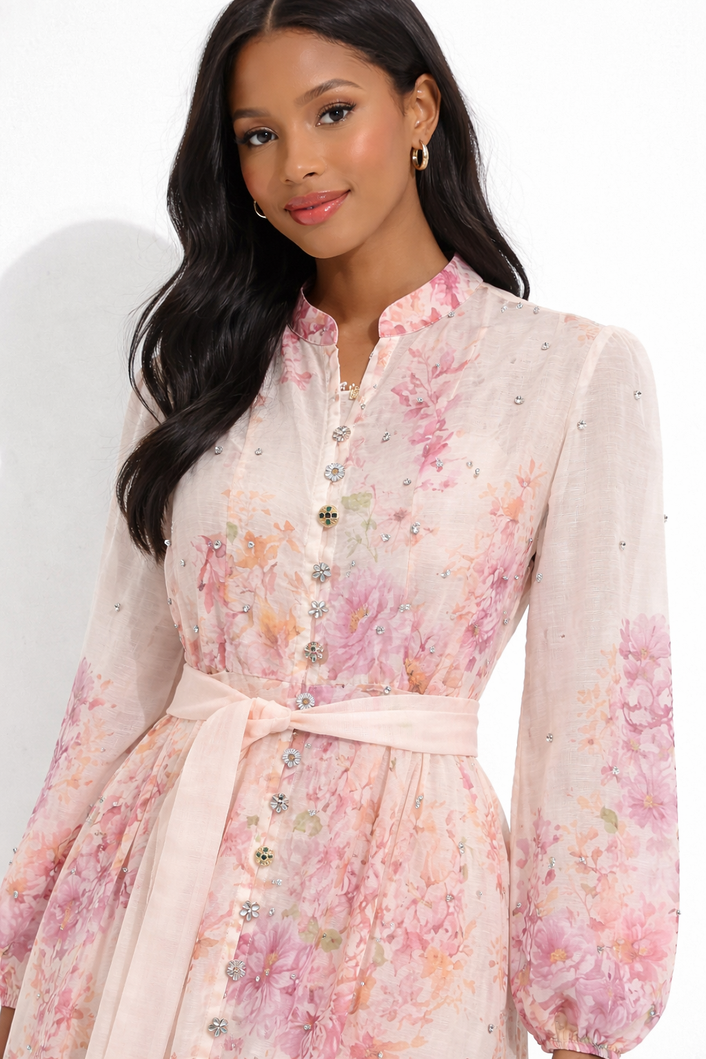 Buttons: A standout feature is the decorative button placket down the front, featuring mixed jewel-style and floral buttons, each unique and ornamental.