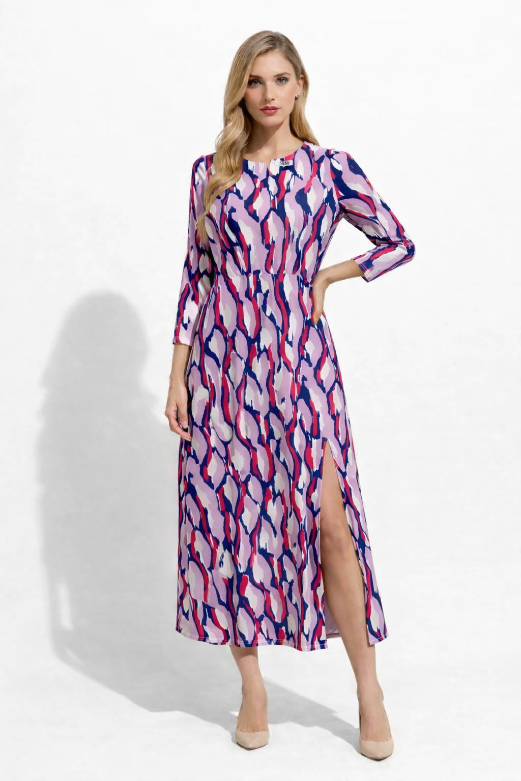 The dress is a just-above-knee-length, long-sleeve fit-and-flare style in a bold abstract print. Here are the key details: