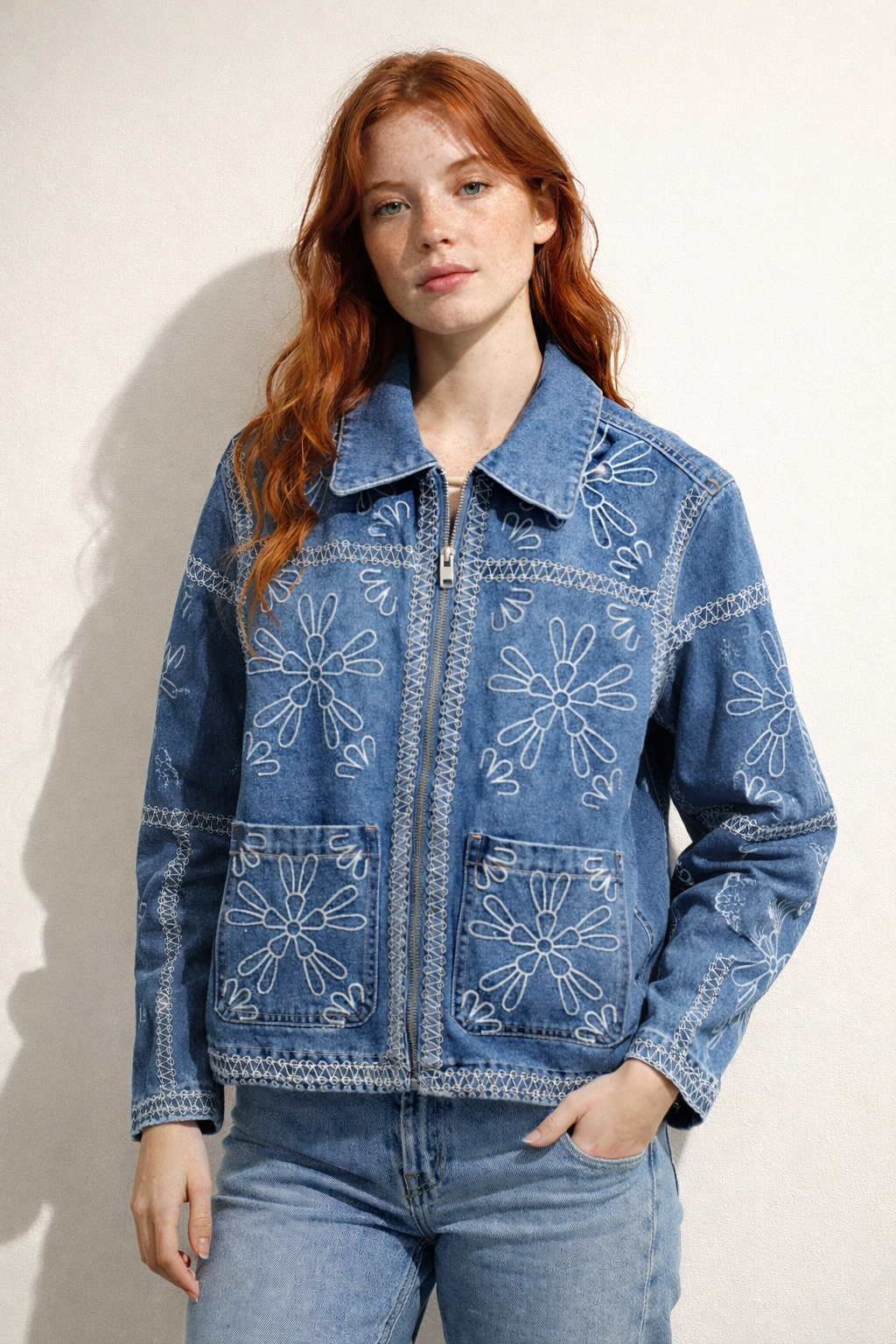 A beautifully detailed denim jacket crafted in a mid-blue wash, featuring delicate white embroidered floral motifs throughout the front and sleeves. The jacket is designed with a classic collar, full zip fastening, and neat contrast stitching that adds definition and character.