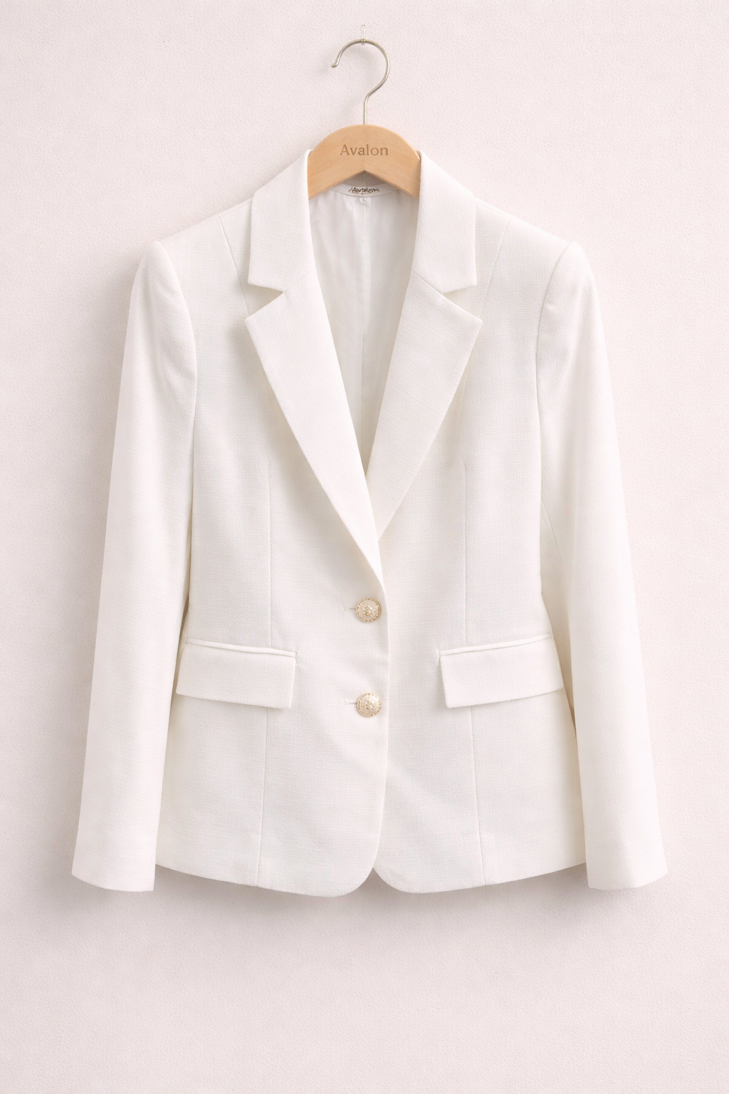 The blazer is designed with a classic notched lapel collar that frames the neckline and enhances its polished silhouette. It features two decorative gold-tone buttons at the front, embossed with an intricate crest detail, adding a refined and luxurious accent.
