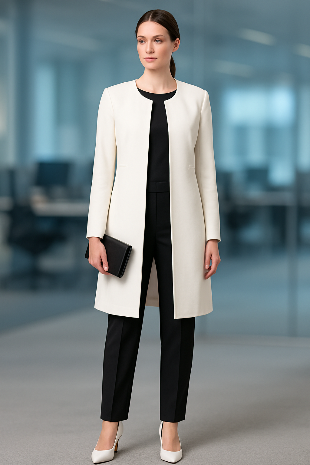 It’s a sophisticated layering piece that bridges the style of a structured coat with the softness of a cardigan — perfect for occasion wear or polished day-to-evening outfits.