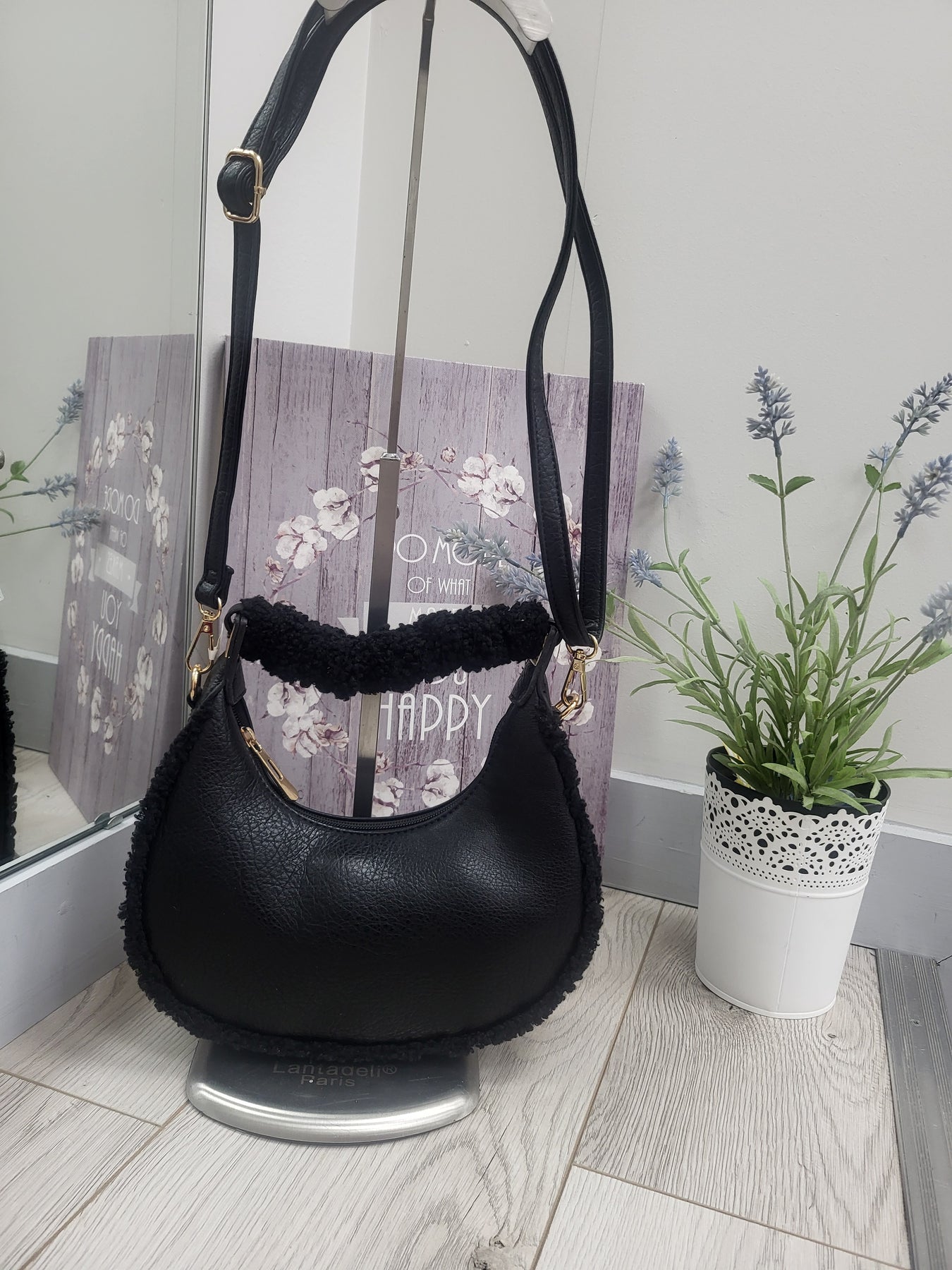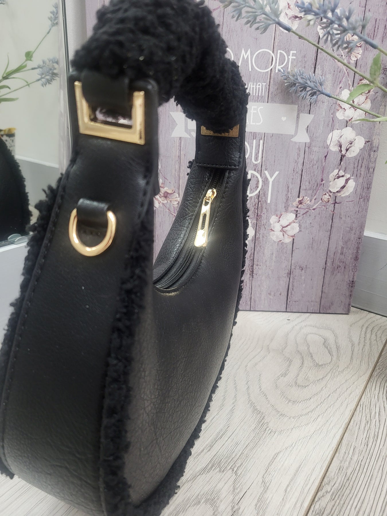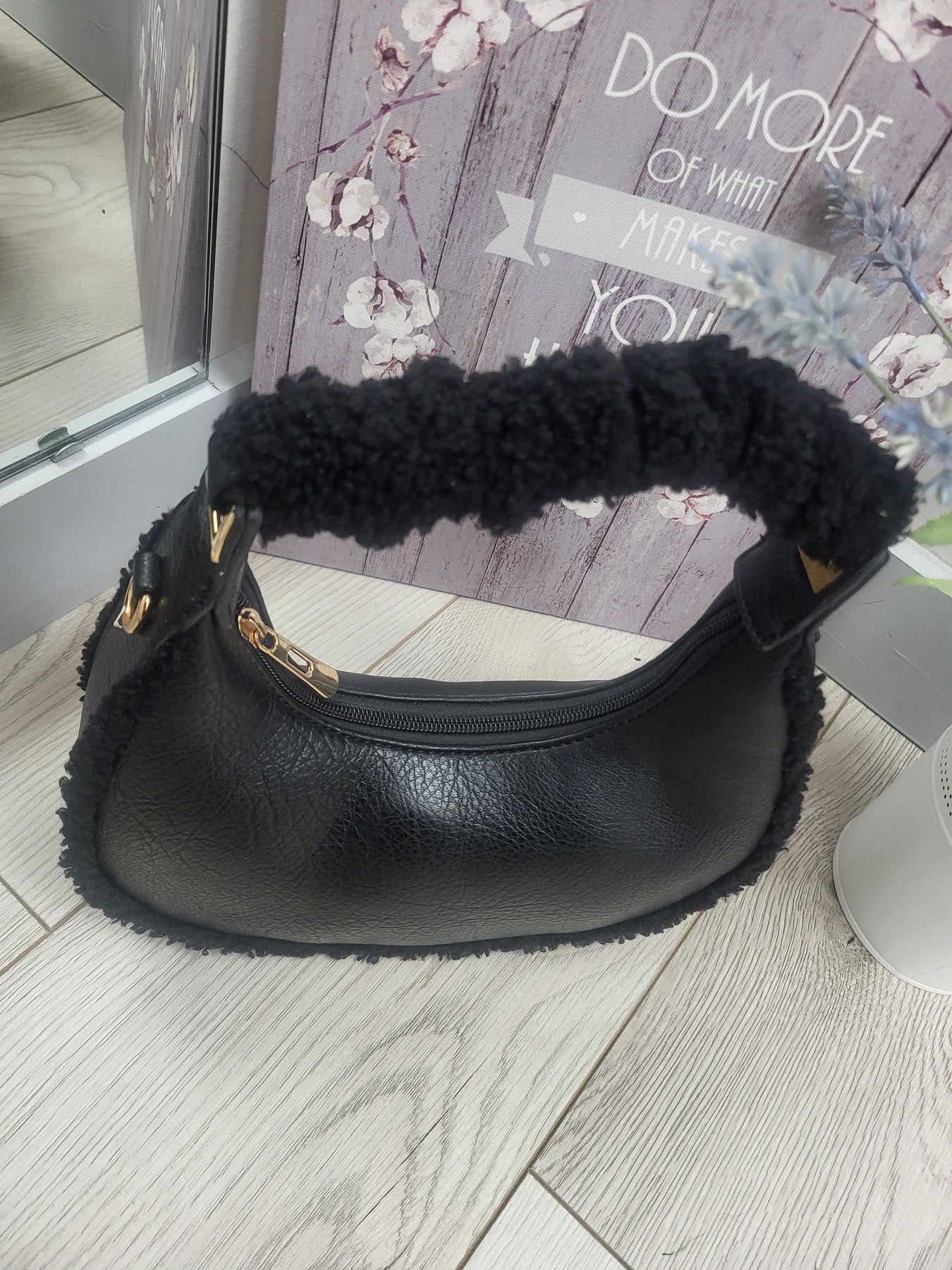 - Matching padded top handle wrapped in fluffy sherpa material for comfort and style