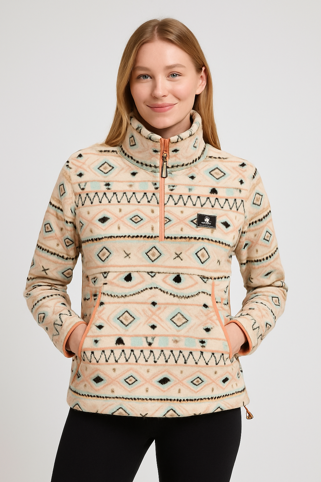This jumper is a soft, plush fleece pullover featuring a light, neutral cream/beige base with an all-over geometric tribal pattern. The design includes small diamonds, arrows, zigzags, and dotted motifs in shades of black, peach, mint green, and light blue, giving it a warm, earthy, boho-inspired look.