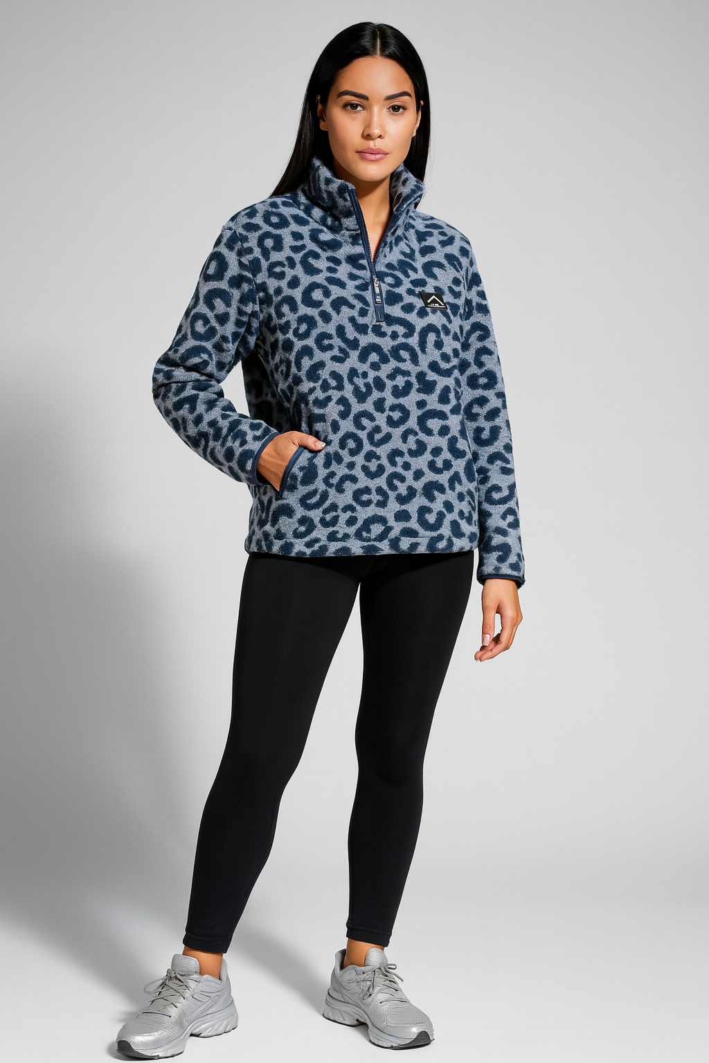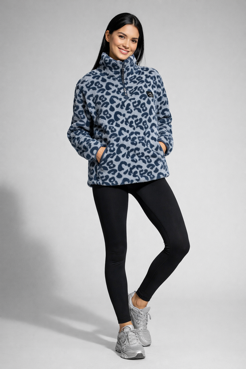 The jumper is a soft, plush fleece pullover featuring a bold blue and grey leopard-print pattern. It has a half-zip front with a stand-up collar for added warmth and style. The zipper has a branded pull tab, and the left chest is finished with a small USCO mountain logo patch.