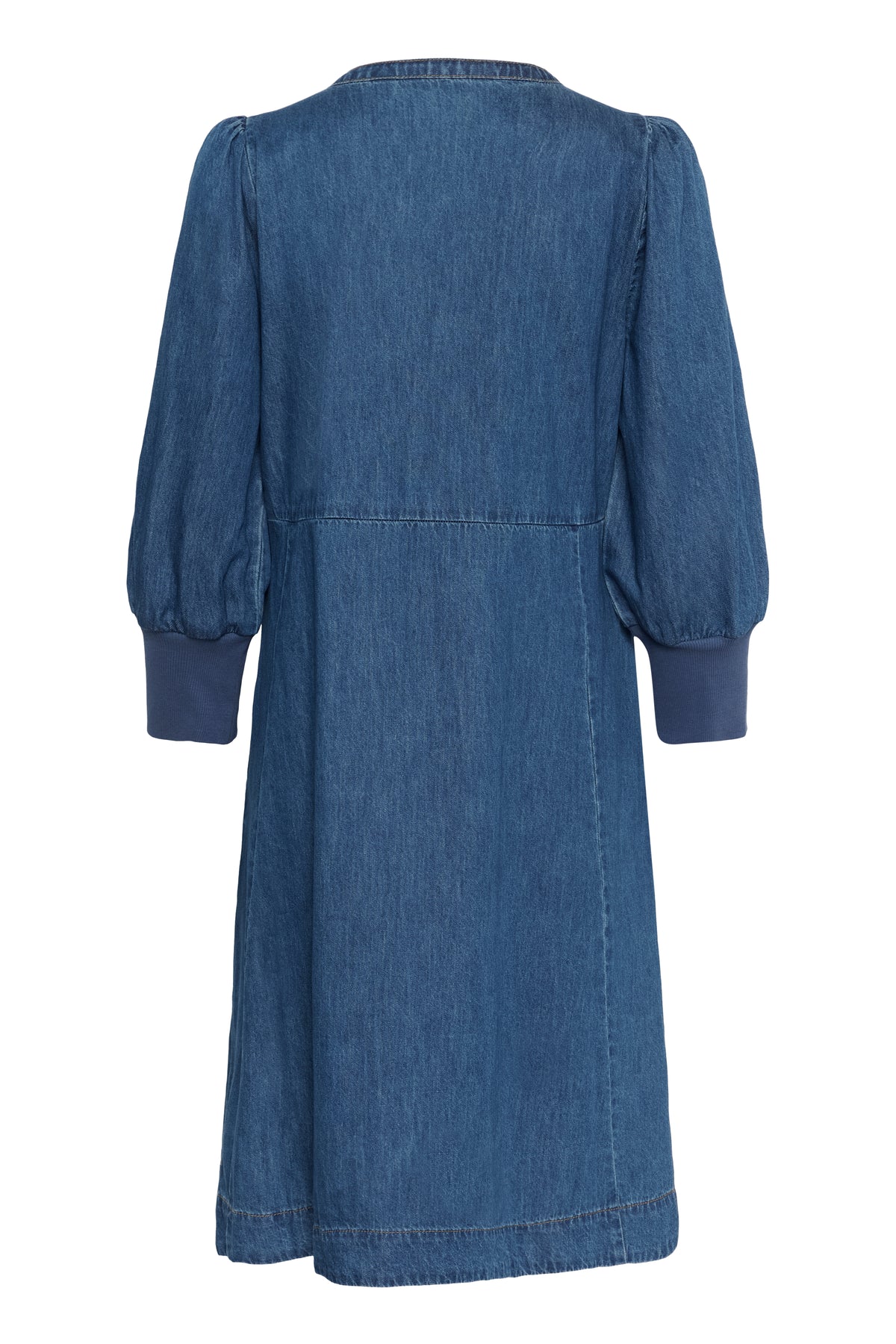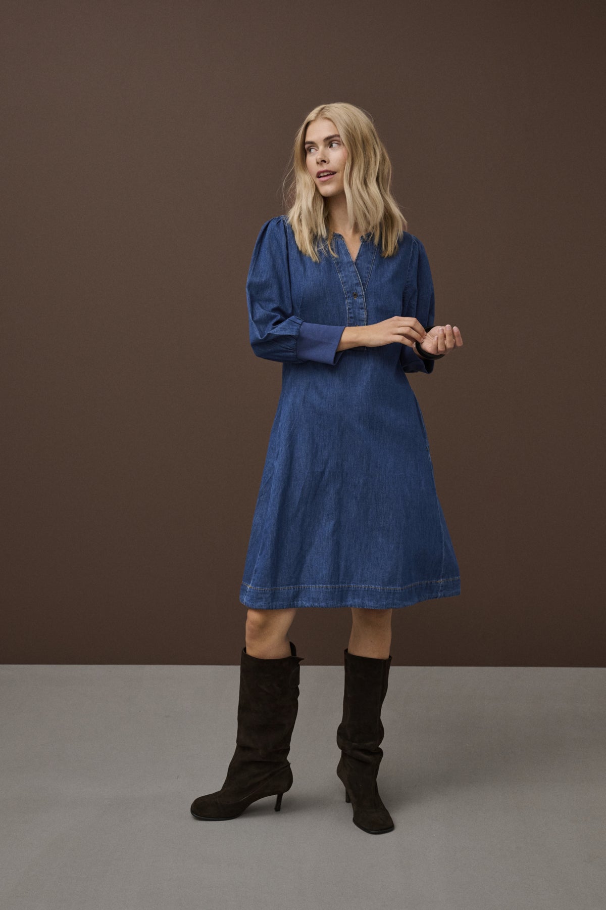 This dress is a knee-length denim dress with a relaxed yet feminine silhouette.