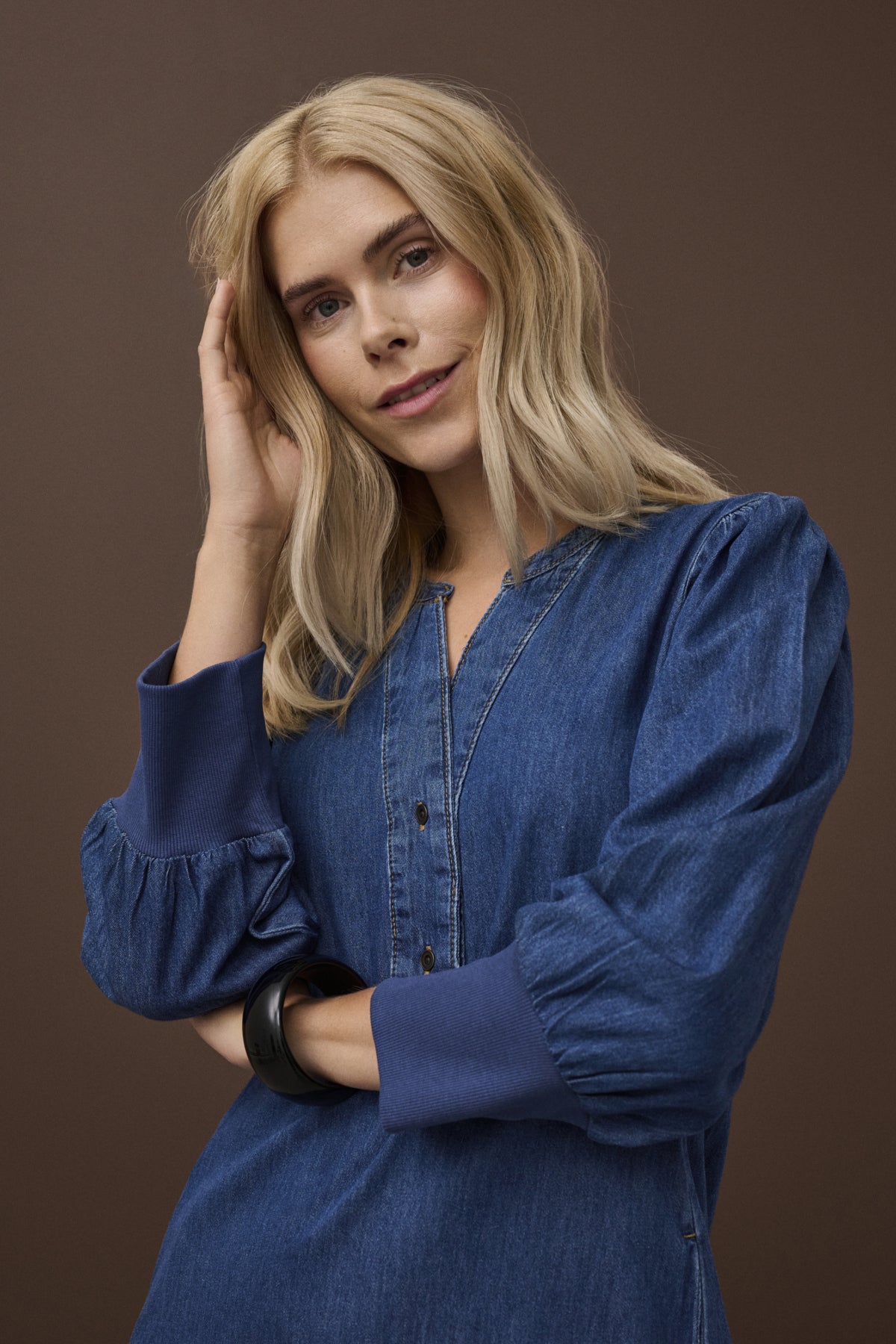 Sleeves: Long sleeves with subtle volume, finished with wide, soft cuffs that can be worn turned up