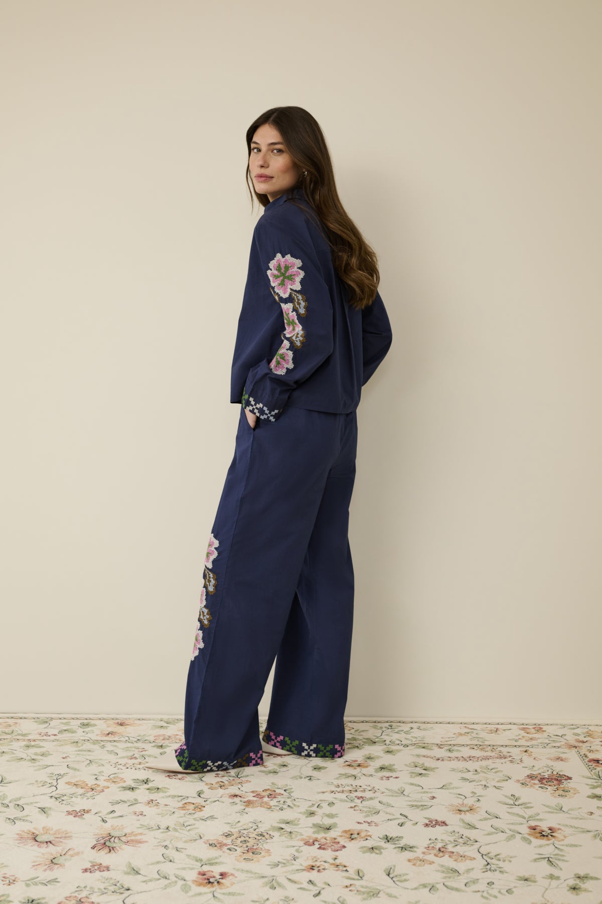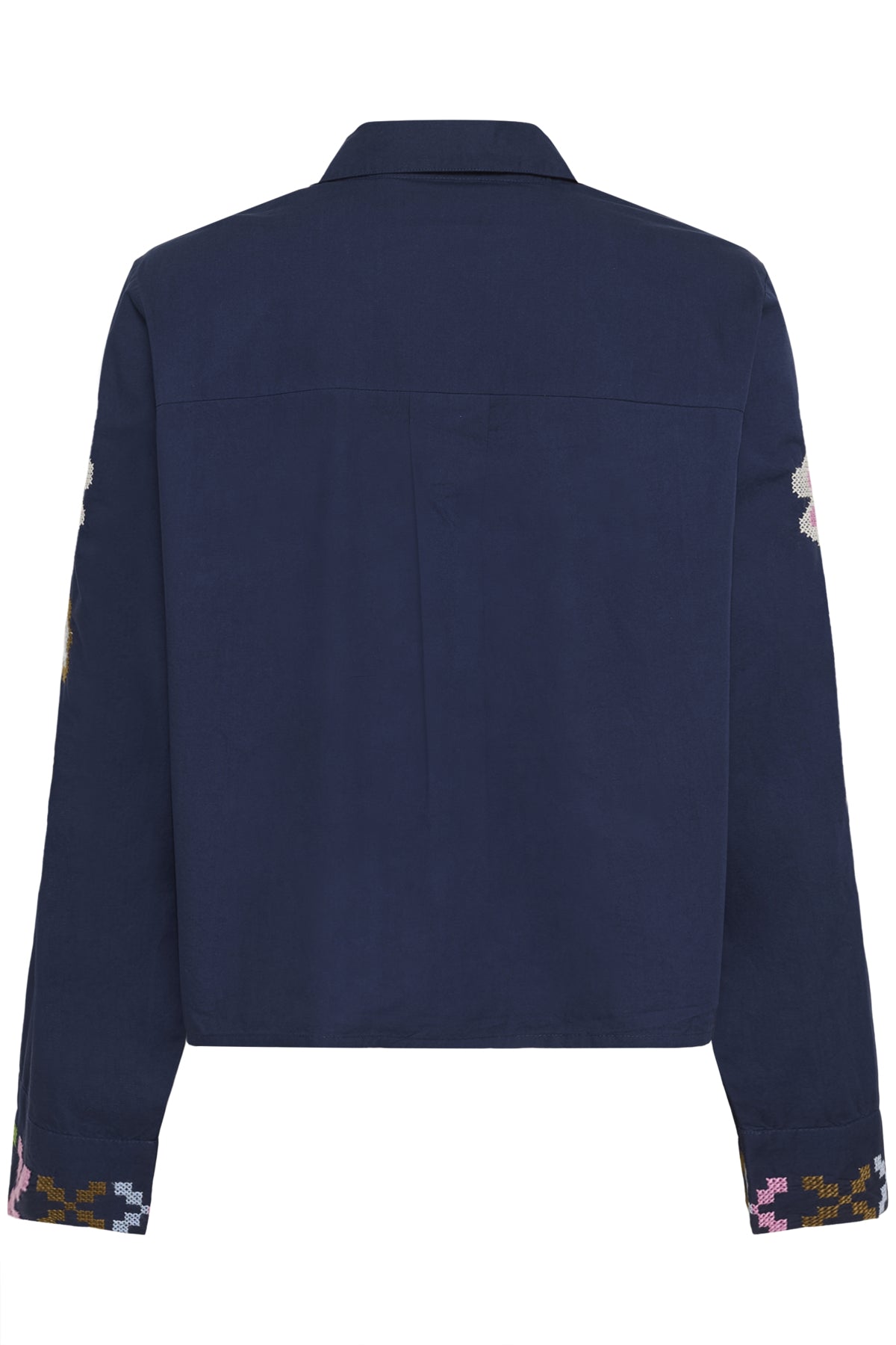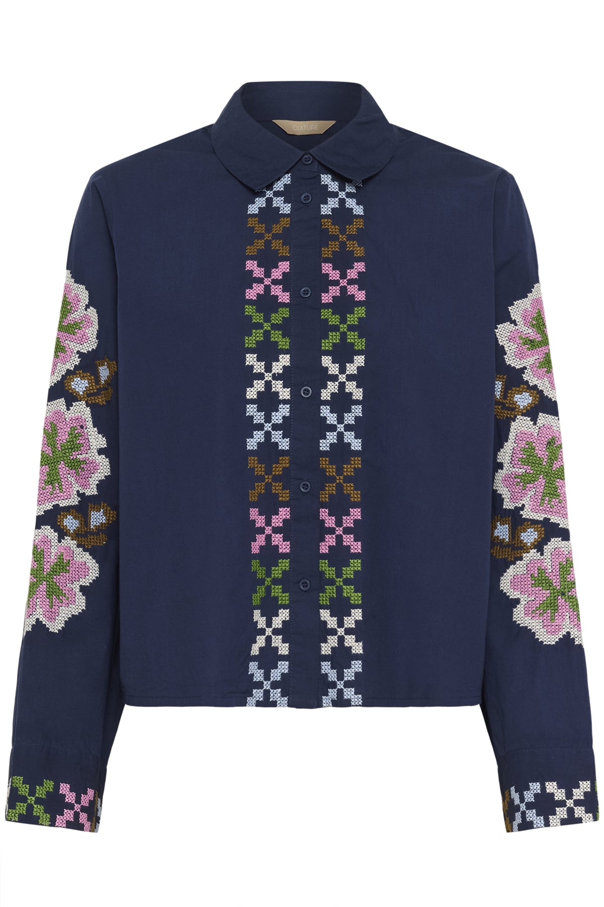 This striking navy blouse features beautiful embroidered detailing that adds a touch of colour and craftsmanship. Designed with a classic collared neckline and full button-through front, it is accented with intricate embroidery running down the centre and along the sleeves. The long sleeves are finished with embroidered cuffs, creating a balanced and eye-catching look. Cut in a relaxed, easy fit, this blouse is perfect for adding interest to simple jeans or tailored trousers, making it an elegant choice for both day and evening wear.