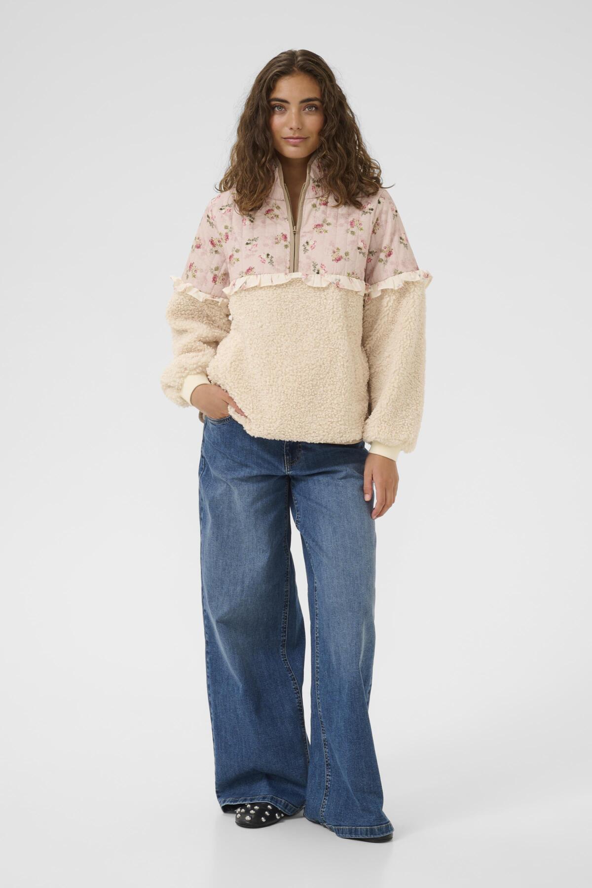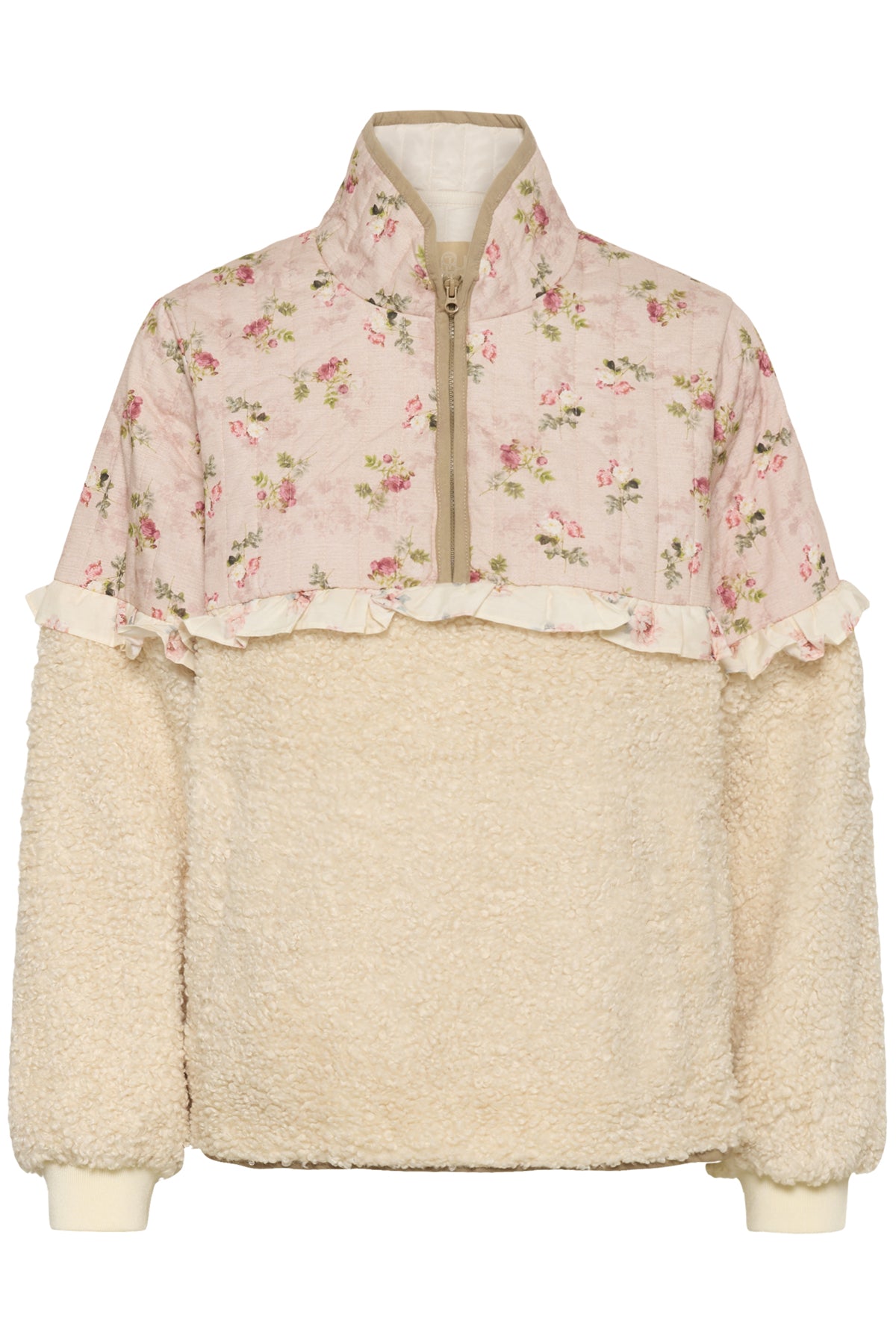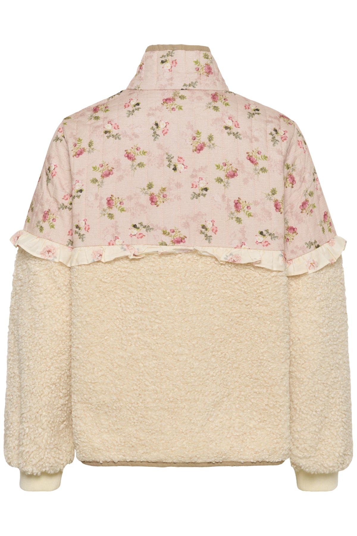 It features a soft cream teddy fleece body that gives warmth and texture, paired with a contrasting blush pink floral upper panel. The top section is delicately printed with small vintage-style pink flowers and subtle vertical stripe detailing, adding a romantic, cottage-inspired feel.