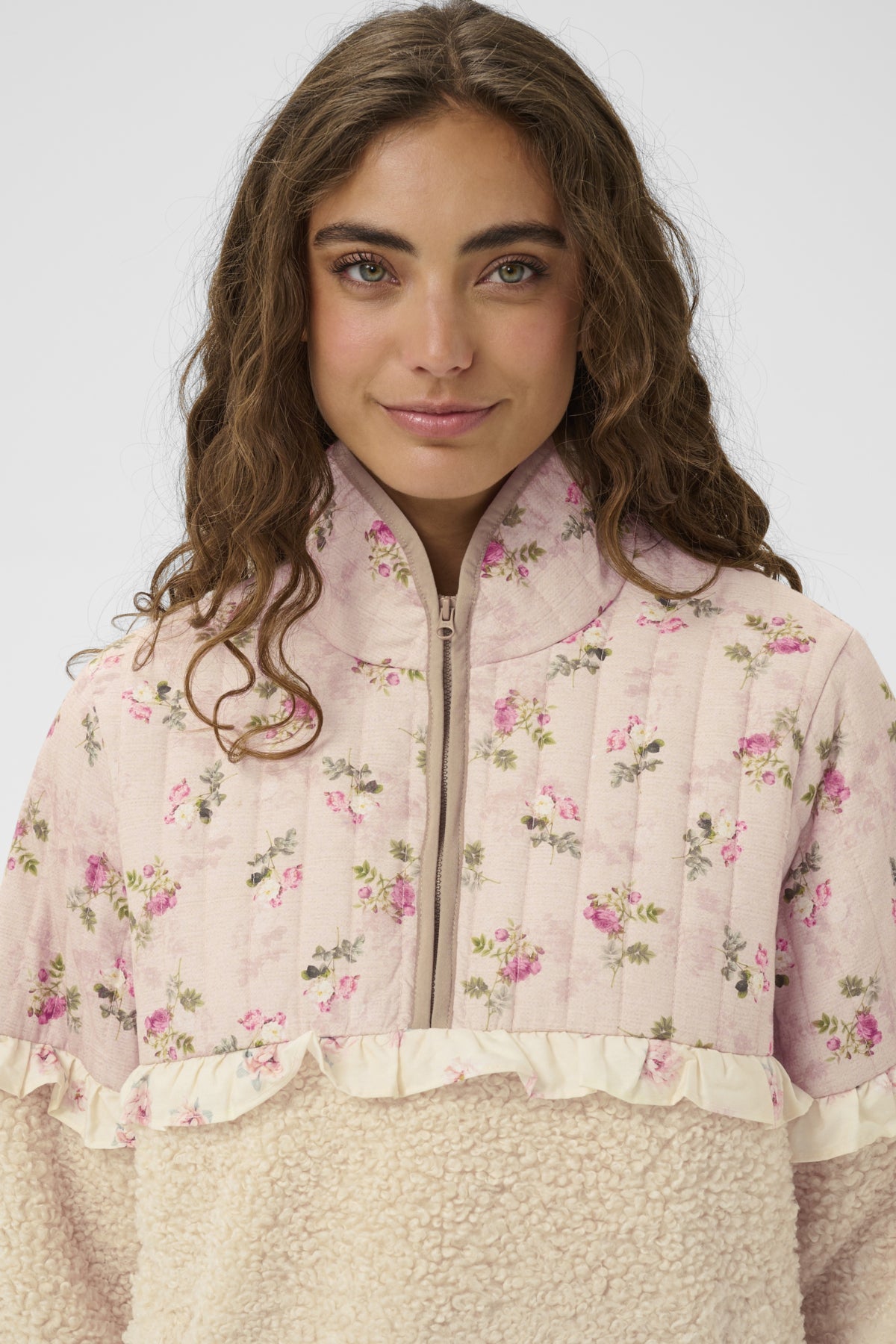 Soft ruffle trim where the floral panel meets the fleece for a flattering, feminine finish