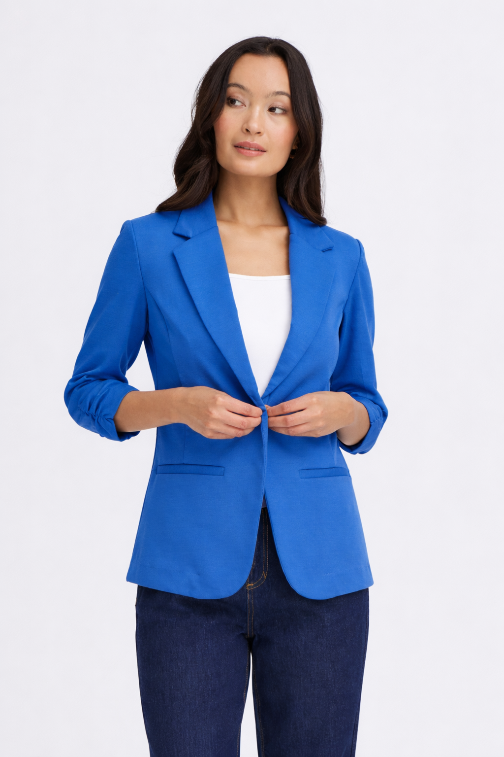 This tailored blazer features a classic single-button design with clean notch lapels for a polished, timeless look. Crafted in a smooth, structured fabric, it offers a flattering fit with shaped seams that enhance the silhouette. The three-quarter-length ruched sleeves add a modern, relaxed touch, making it perfect for both smart and casual styling. Finished with subtle welt pockets and a gently curved hem, it’s an easy-to-wear piece that transitions effortlessly from day to evening.