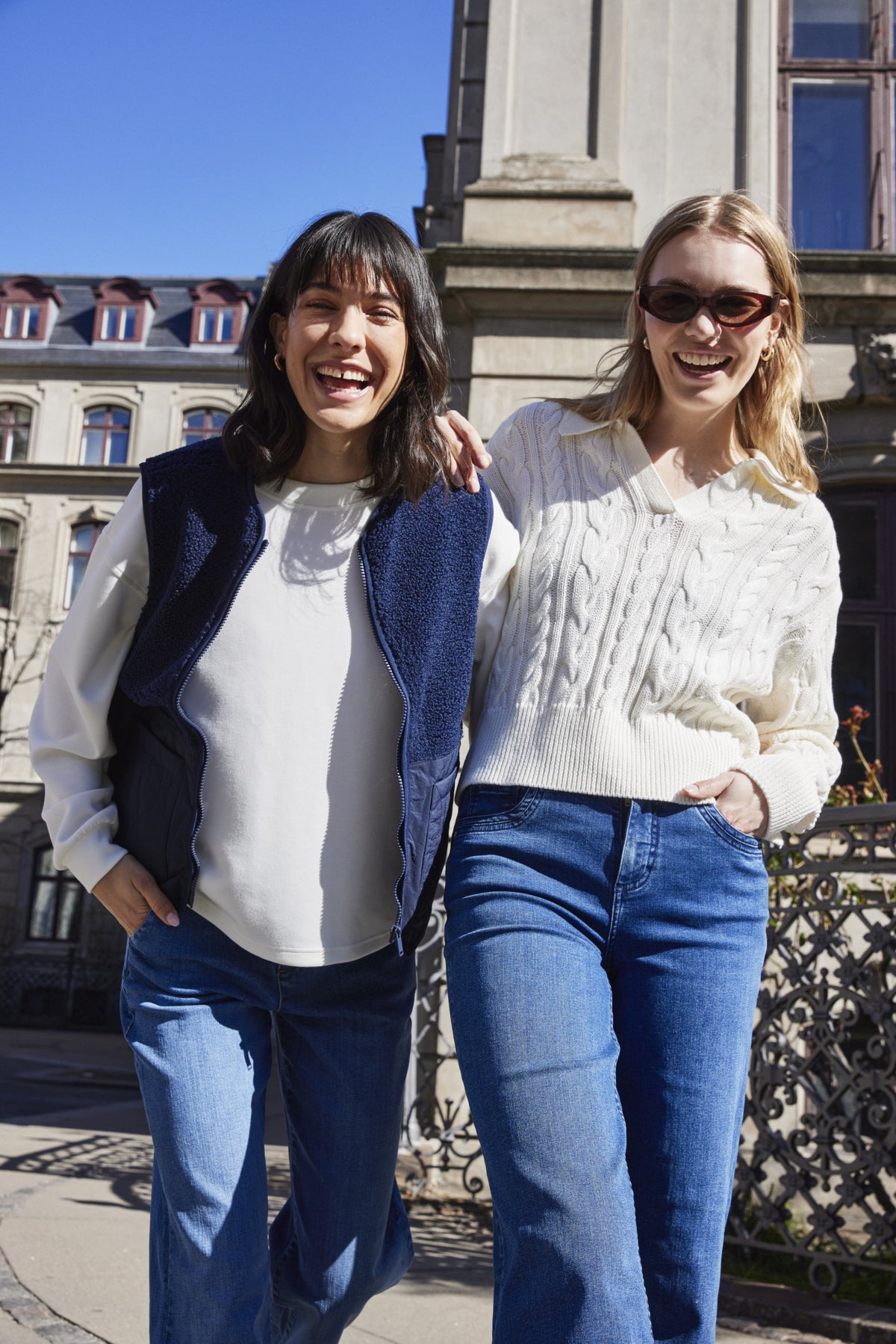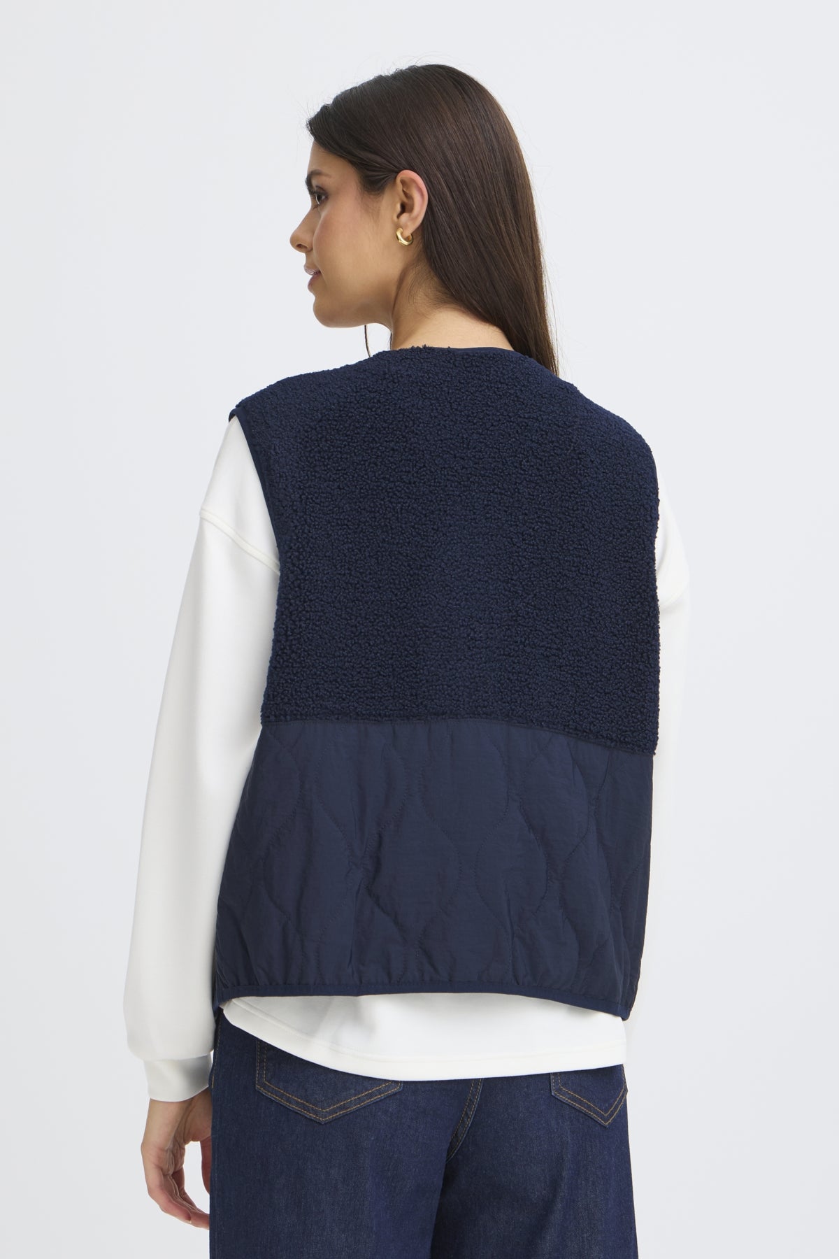 This stylish navy gilet is the perfect layering piece for cooler days. Designed with a soft teddy fleece upper and a lightly padded quilted lower panel, it offers warmth without feeling bulky. The relaxed fit makes it easy to layer over jumpers or sweatshirts, while the full zip front and neat round neckline give a clean, modern finish. Complete with practical front pockets and a smooth lining, this versatile gilet is ideal for everyday wear, casual outings, and effortless off-duty styling.