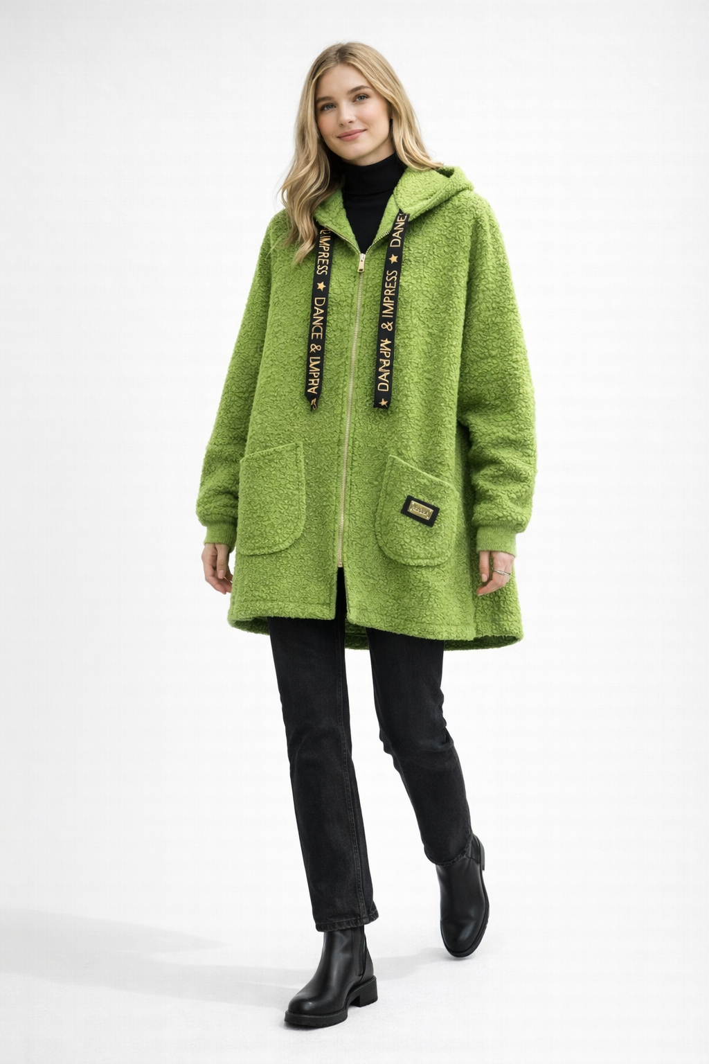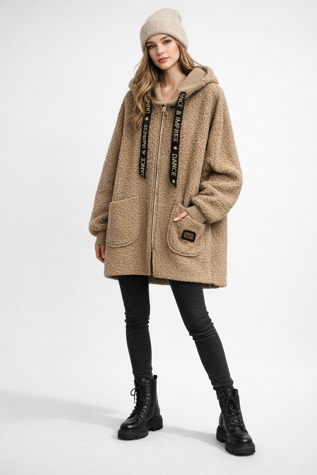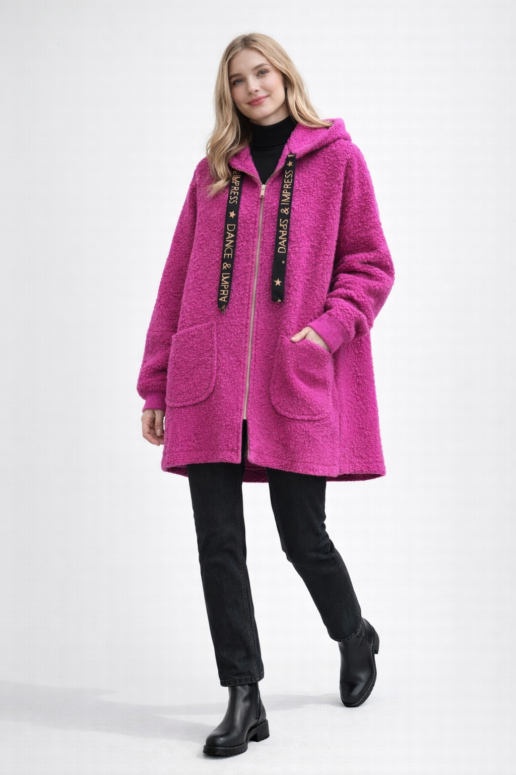 The jacket features a full-length gold-tone zip with a circular pull, adding a subtle statement detail. A generous hood provides extra warmth and a casual edge, complemented by wide ribbon drawstrings printed with “DANCE & IMPRESS” for a bold, fashion-forward touch.