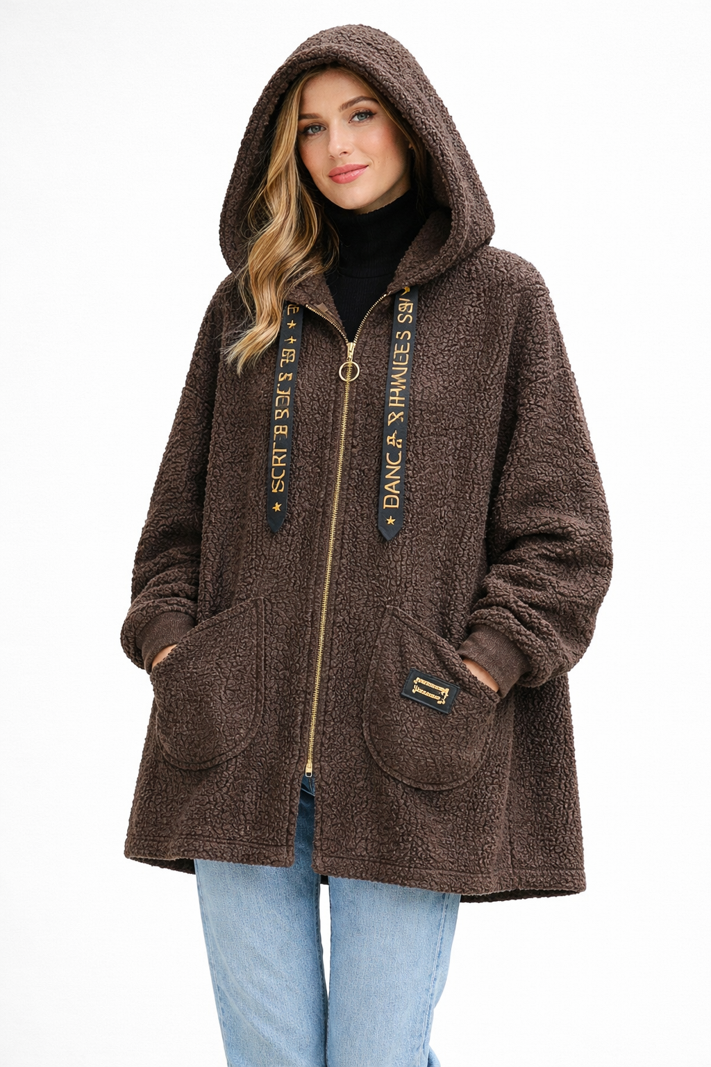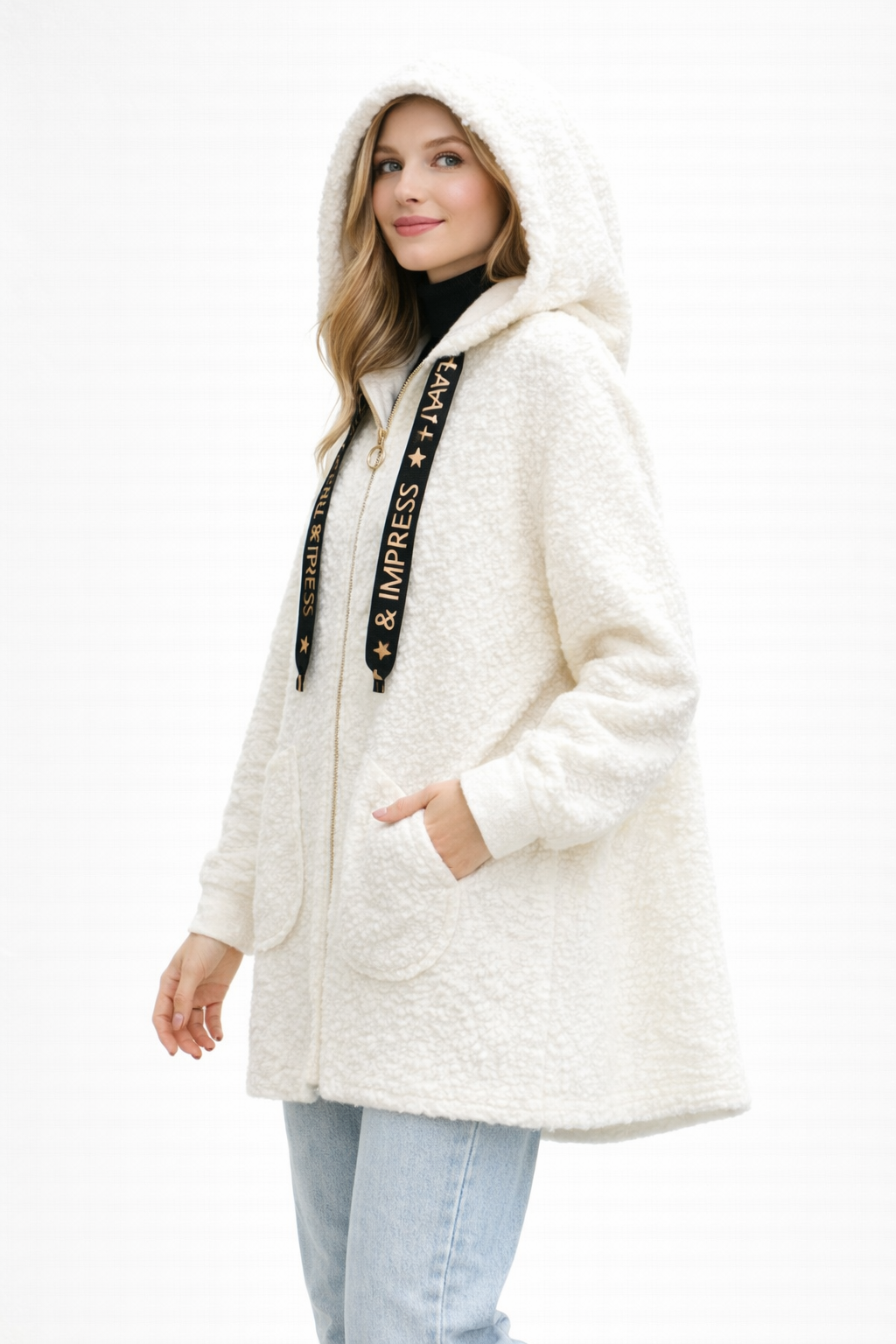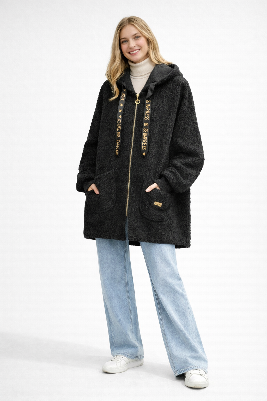 The jacket features a full-length gold-tone zip with a circular pull, adding a subtle statement detail. A generous hood provides extra warmth and a casual edge, complemented by wide ribbon drawstrings printed with “DANCE & IMPRESS” for a bold, fashion-forward touch.