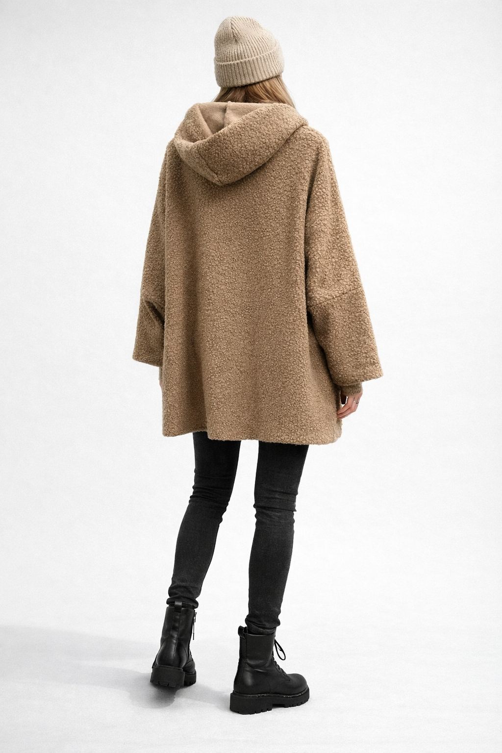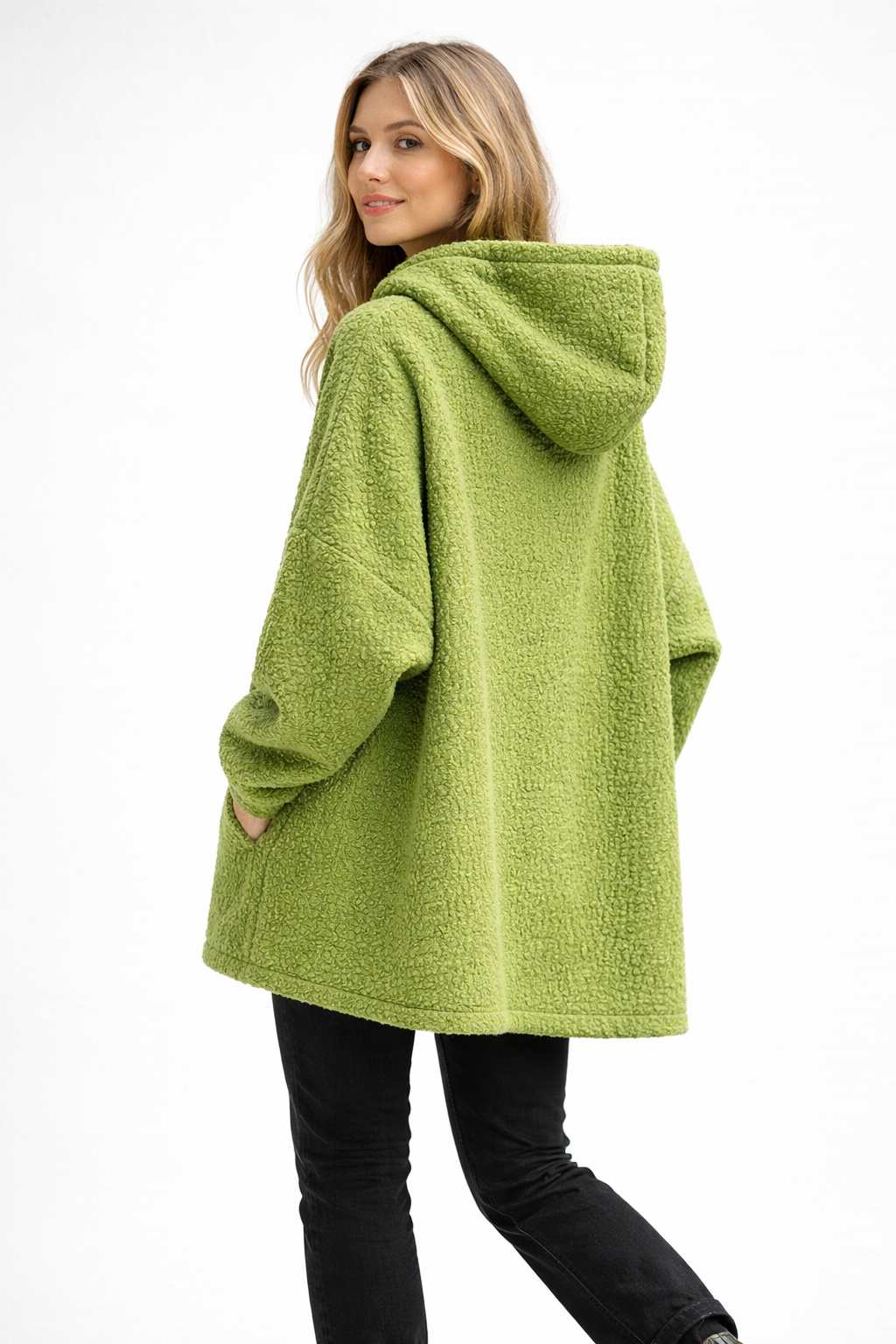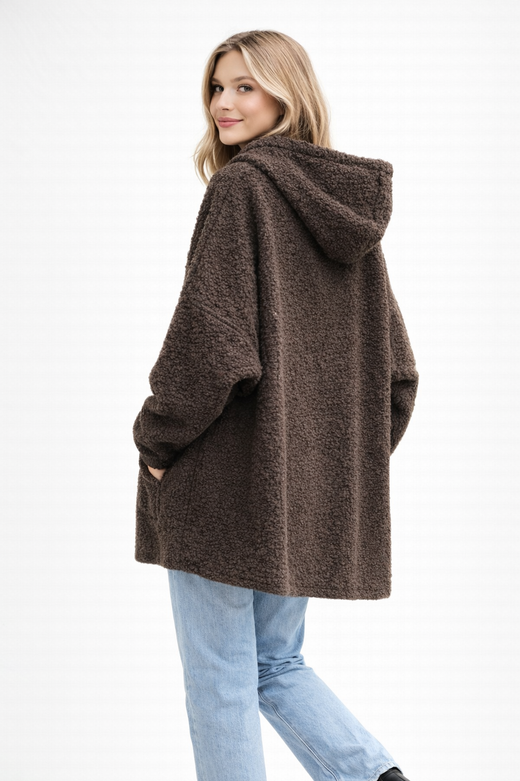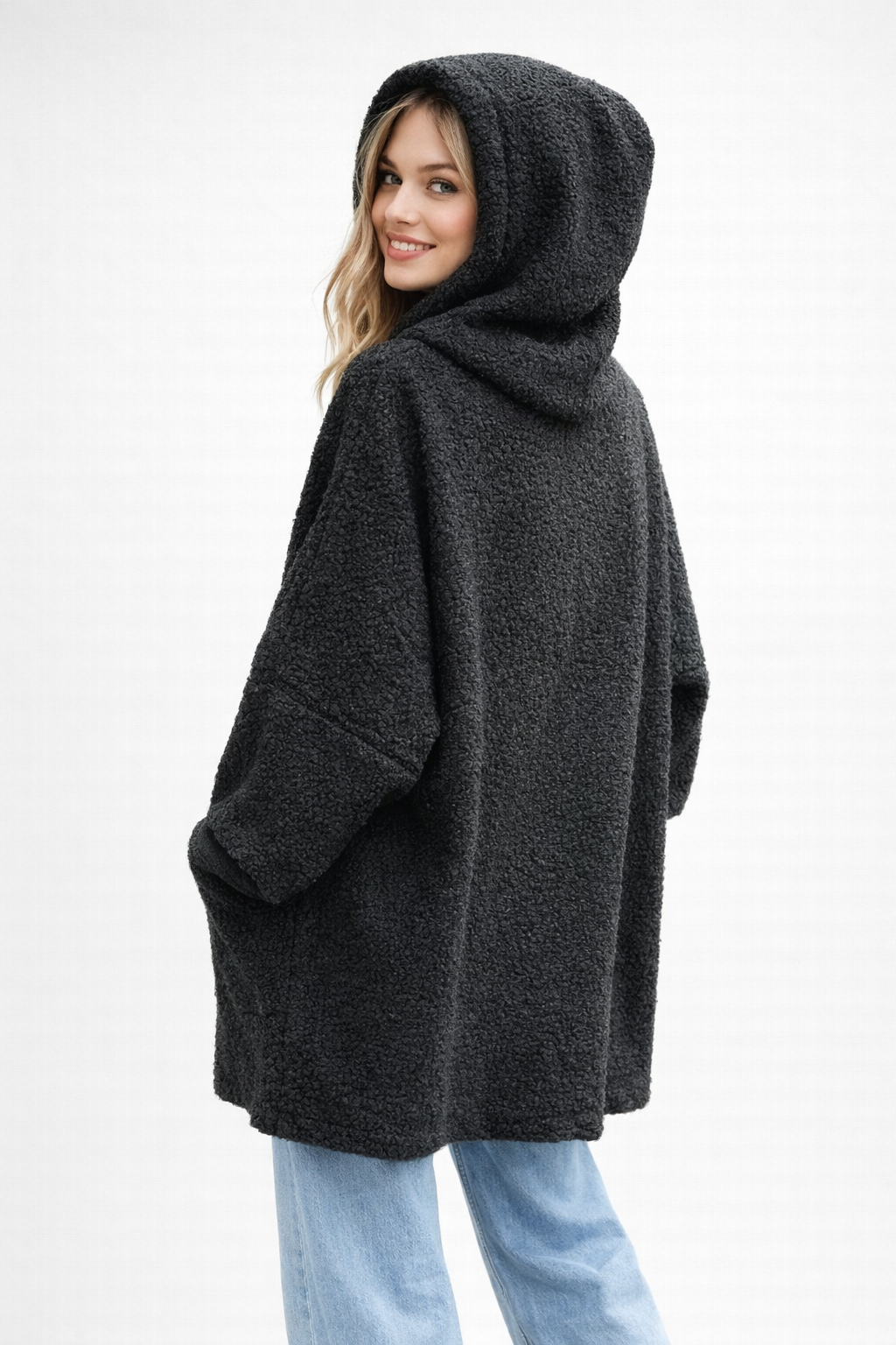 This oversized sherpa hoodie jacket is designed for effortless comfort and everyday style. Crafted from a soft, textured boucle fleece, it delivers a cozy, warm feel while maintaining a modern, relaxed silhouette.