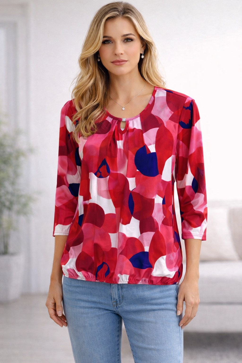 The blouse is a lightweight, casual printed top with a soft, flowing silhouette and feminine details.