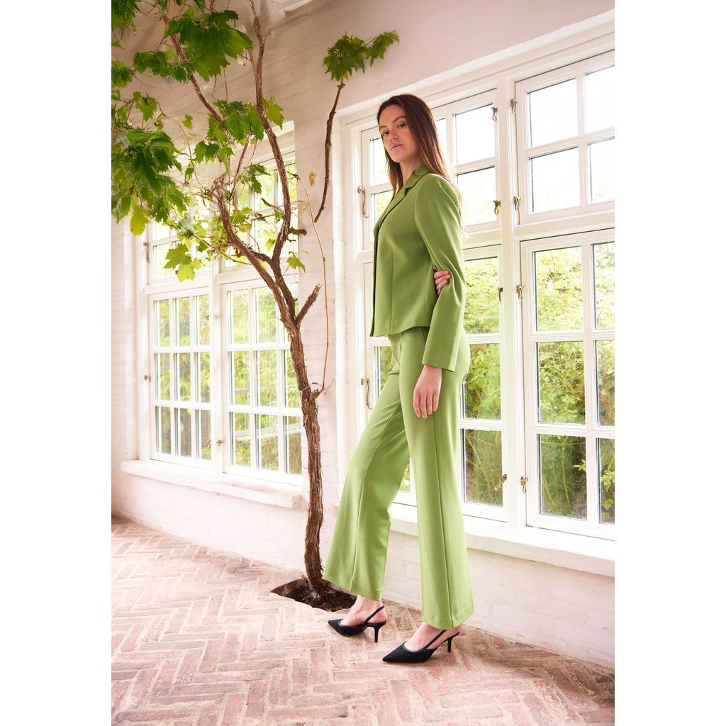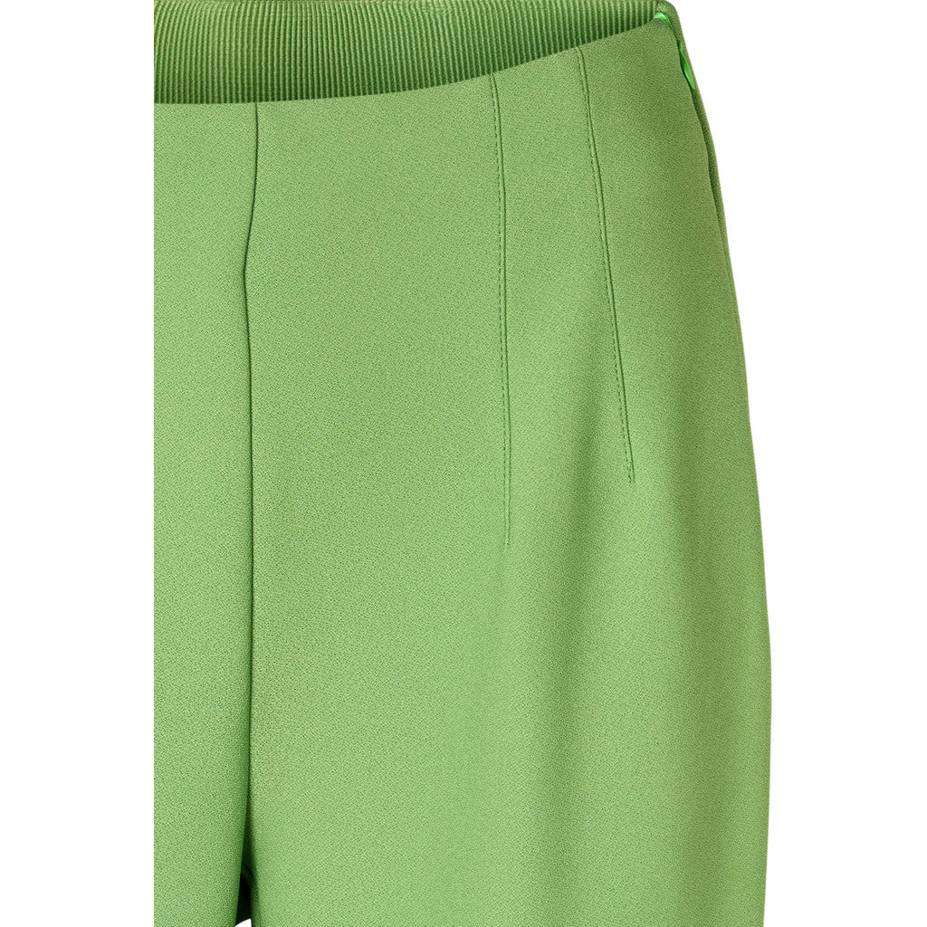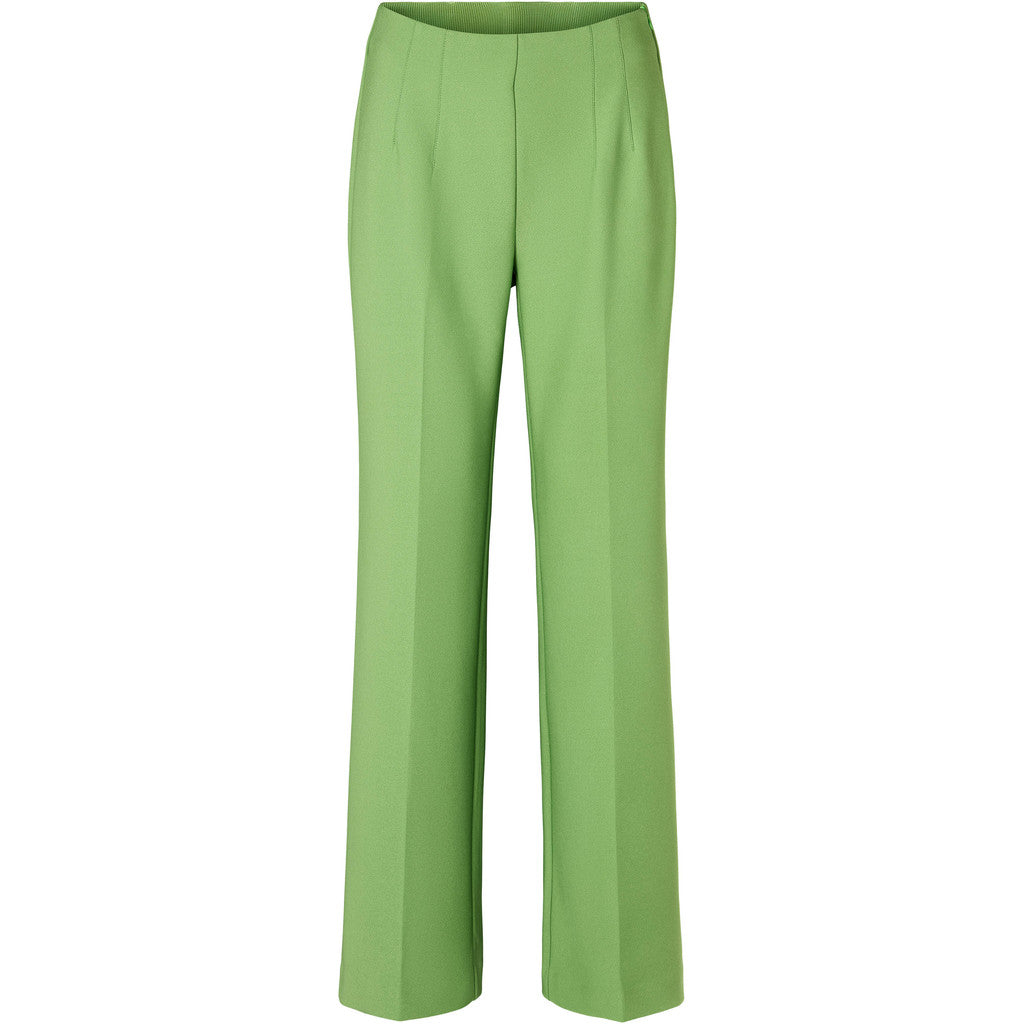 These trousers are a sleek, tailored wide-leg style in a fresh apple green shade.