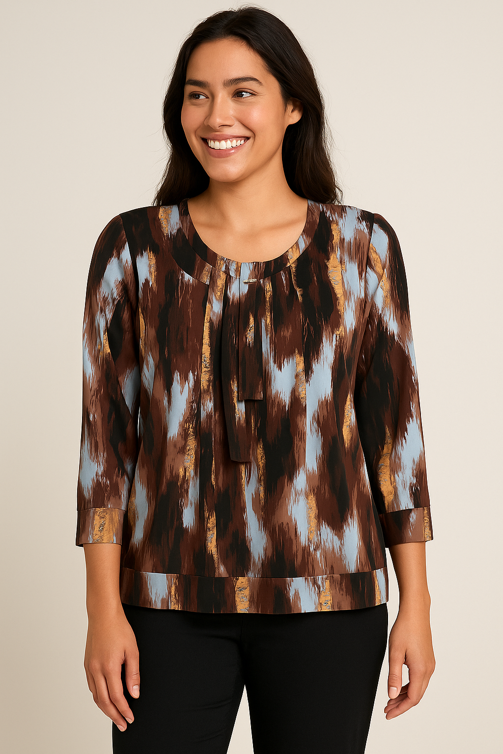 The blouse is a beautifully patterned top featuring an abstract brushstroke print in shades of chocolate brown, caramel, black, golden ochre, and soft sky blue. It has a rounded neckline with a short fabric tie detail at the center, accented by a small metallic bow embellishment. The sleeves are long with a subtle cuff finish, and the hemline falls neatly at the hips with a clean, structured edge. The material appears soft and flowy, giving it an elegant yet comfortable look — perfect for both casual and dressy occasions.