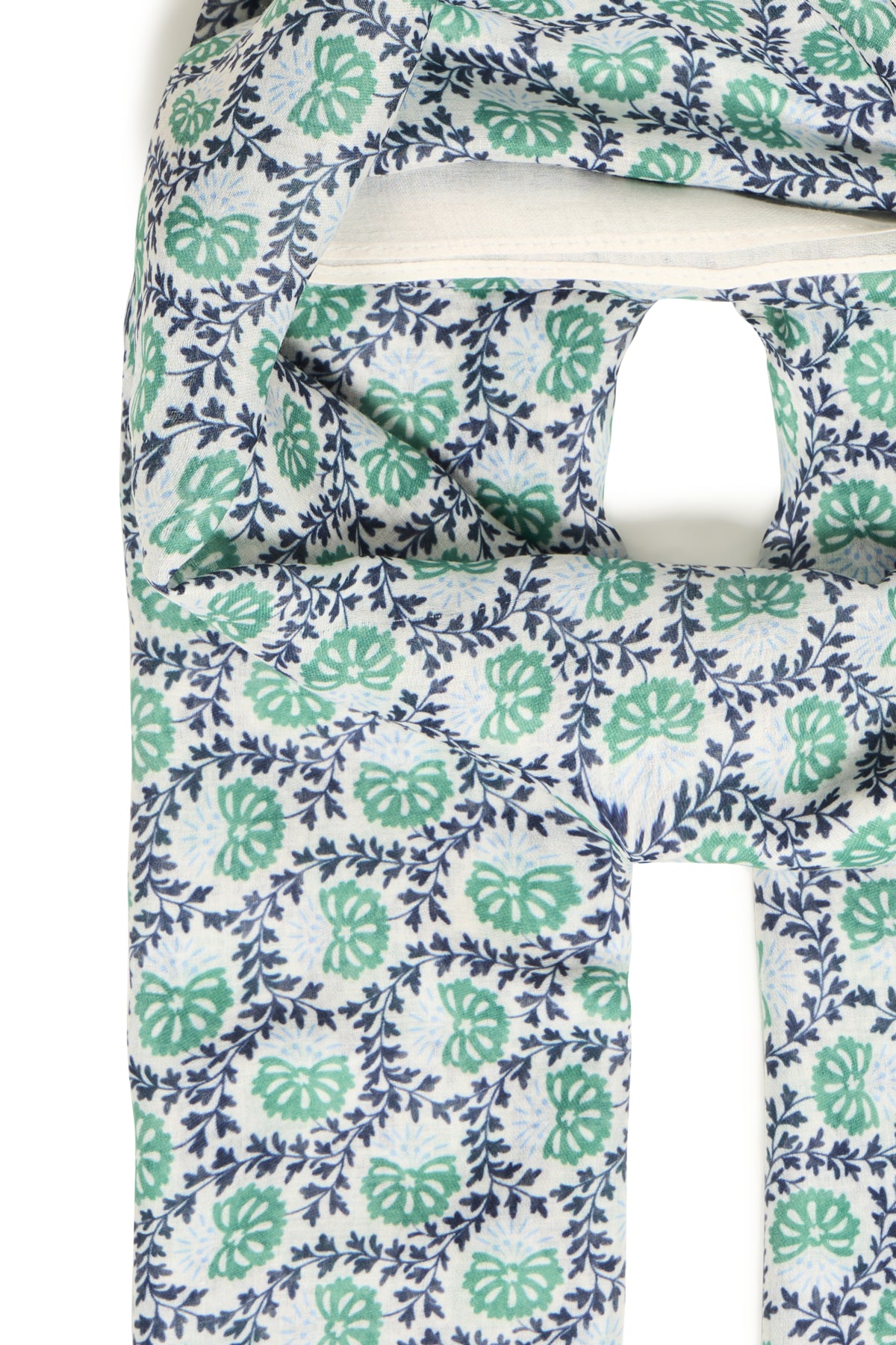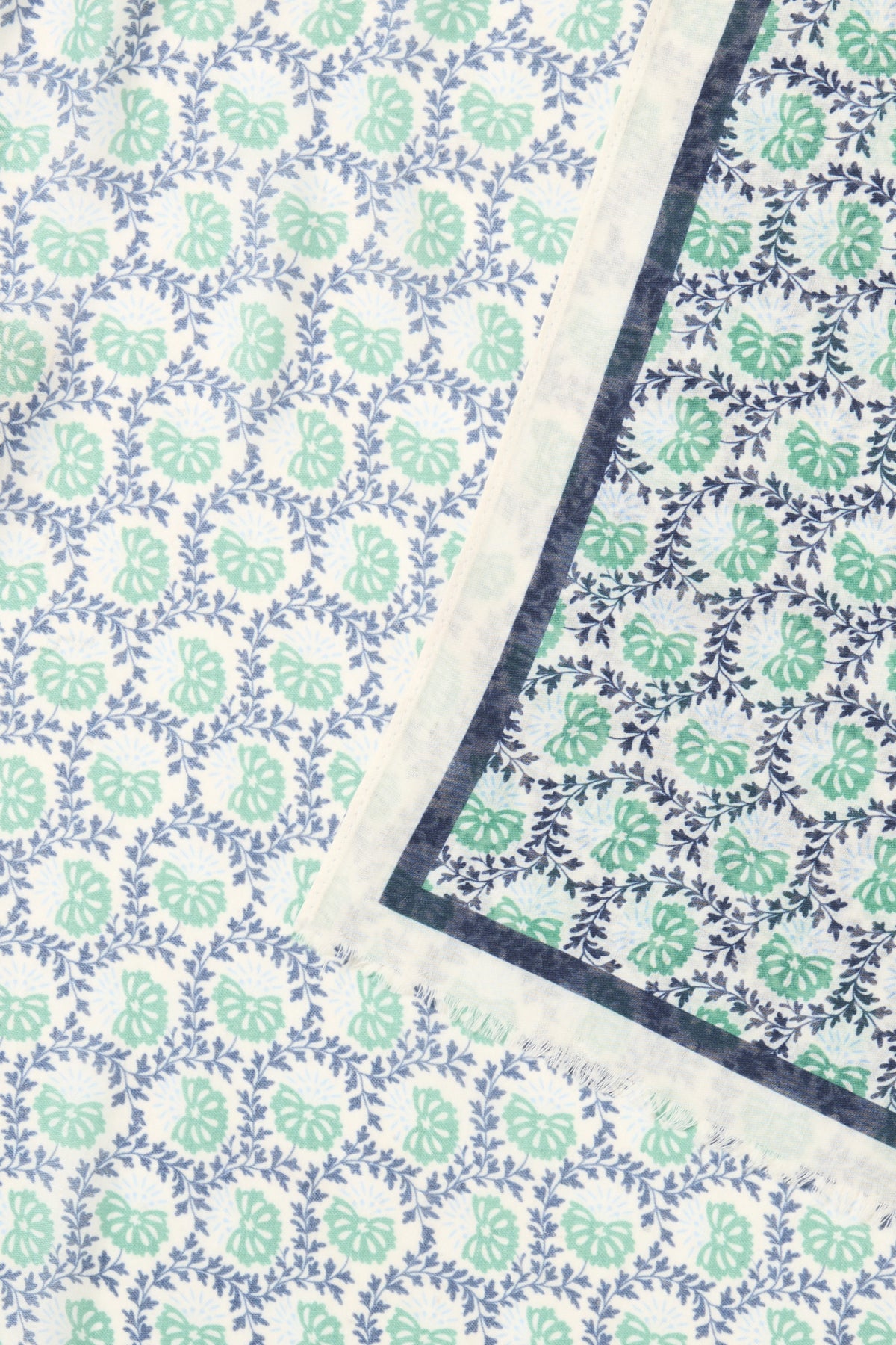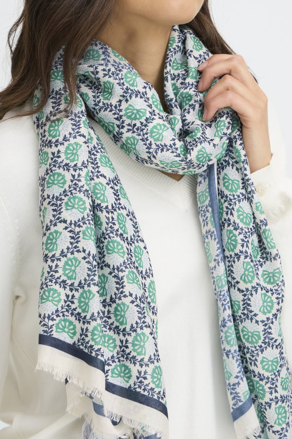 The scarf features a delicate all-over floral motif in soft green and navy on a light cream background. It has a classic rectangular shape with a neat navy border and lightly fringed ends, giving it a polished yet relaxed feel. Lightweight and airy, it’s ideal for layering and adds a fresh pop of colour to neutral outfits.