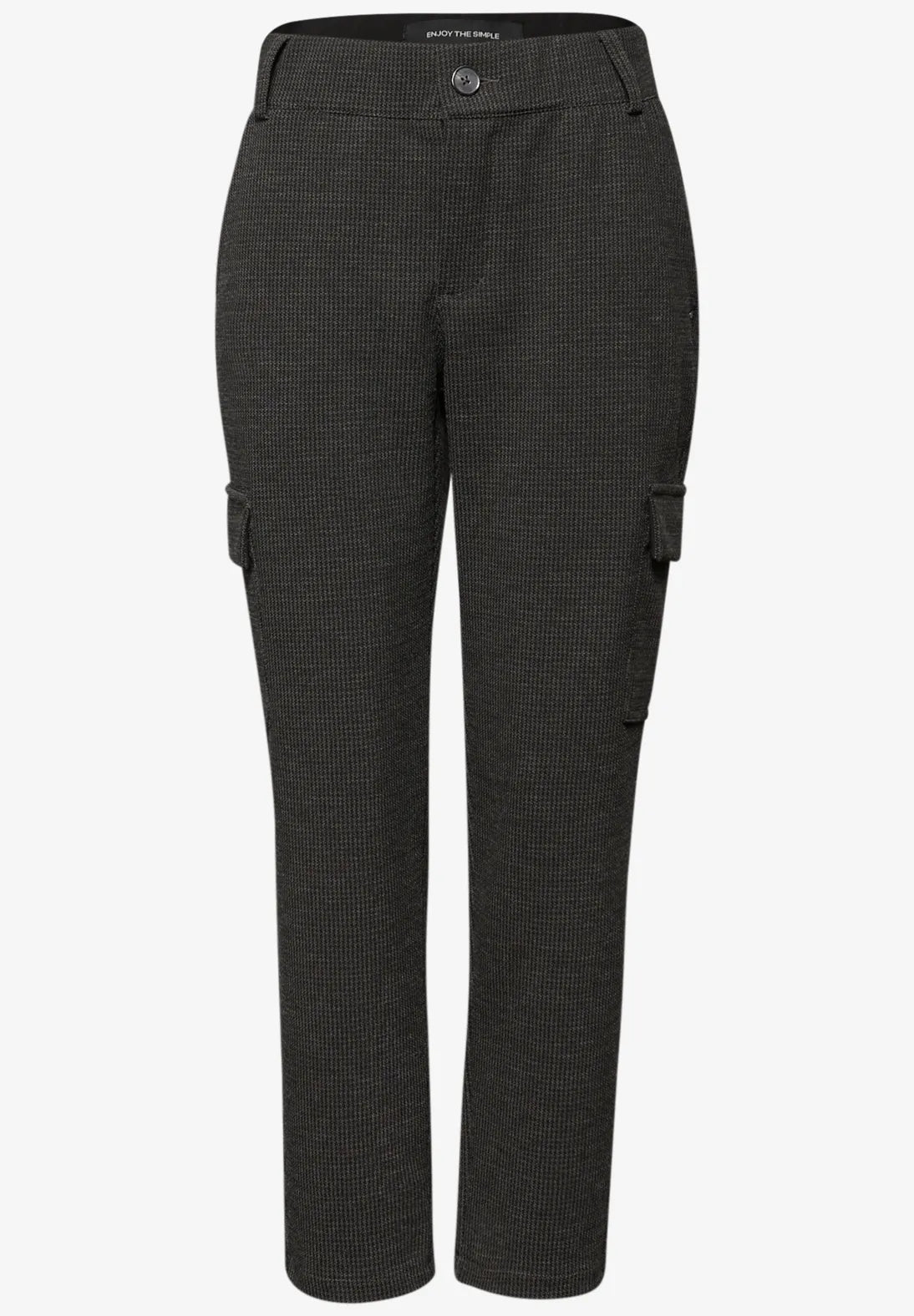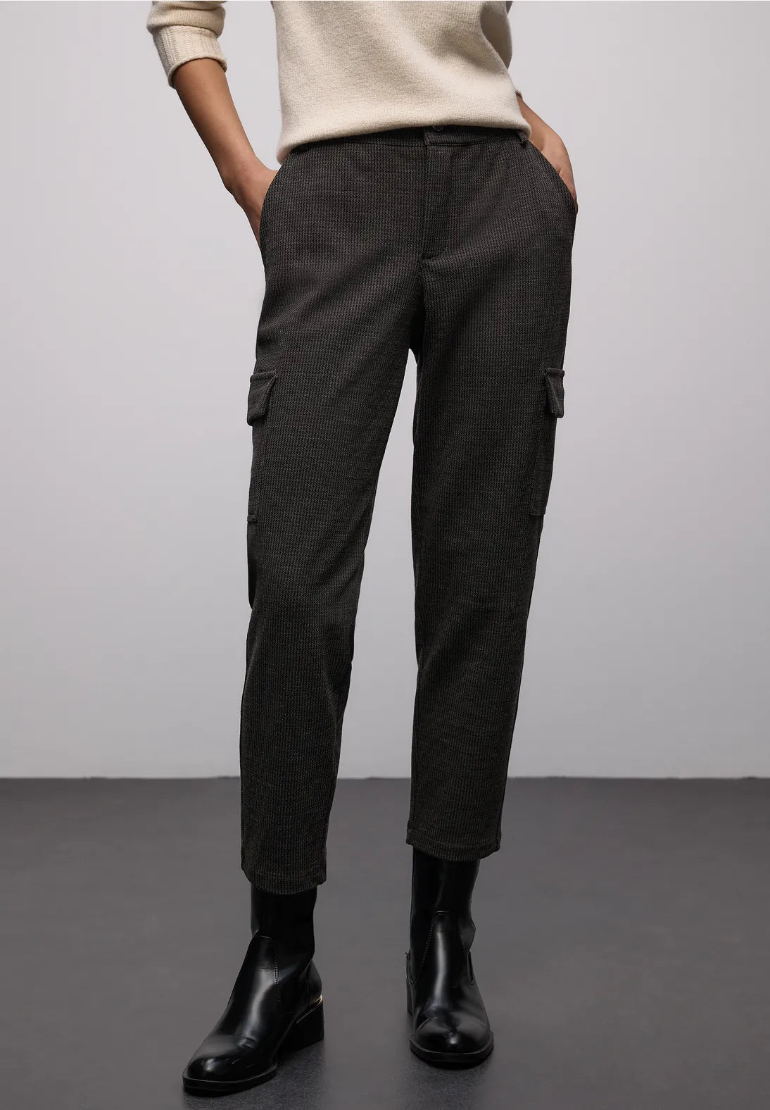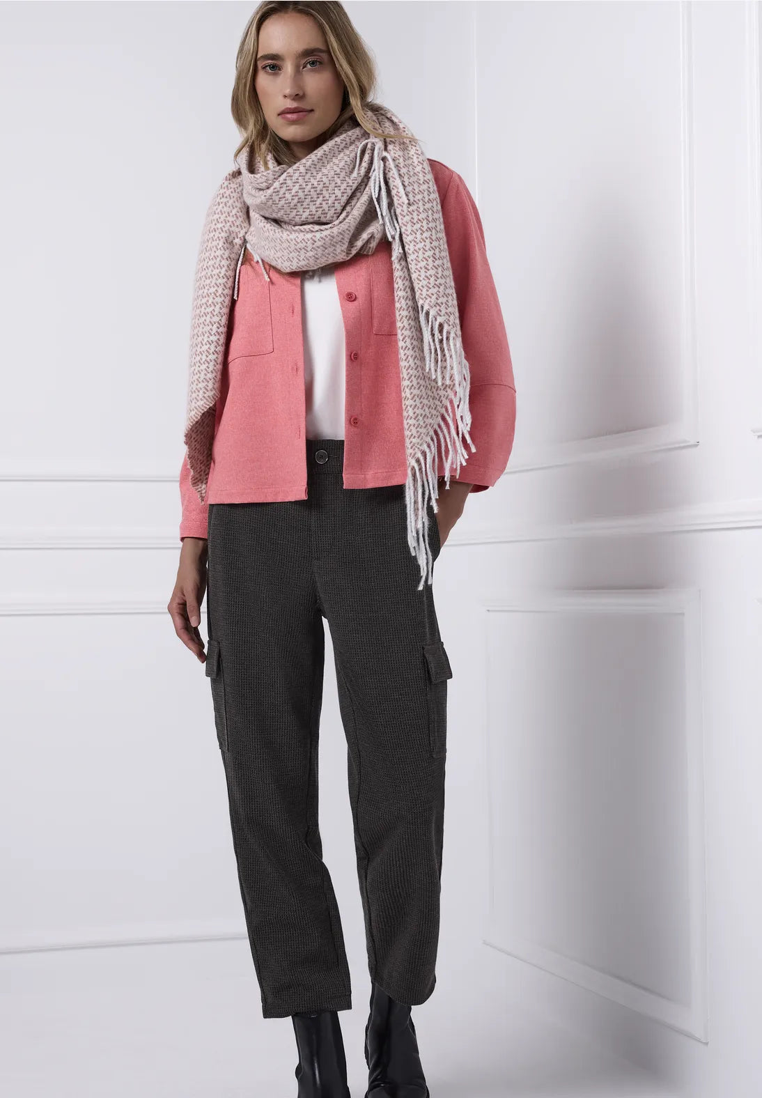 Woman wearing a pink coat, white shirt, black pants, and a patterned scarf against a white background